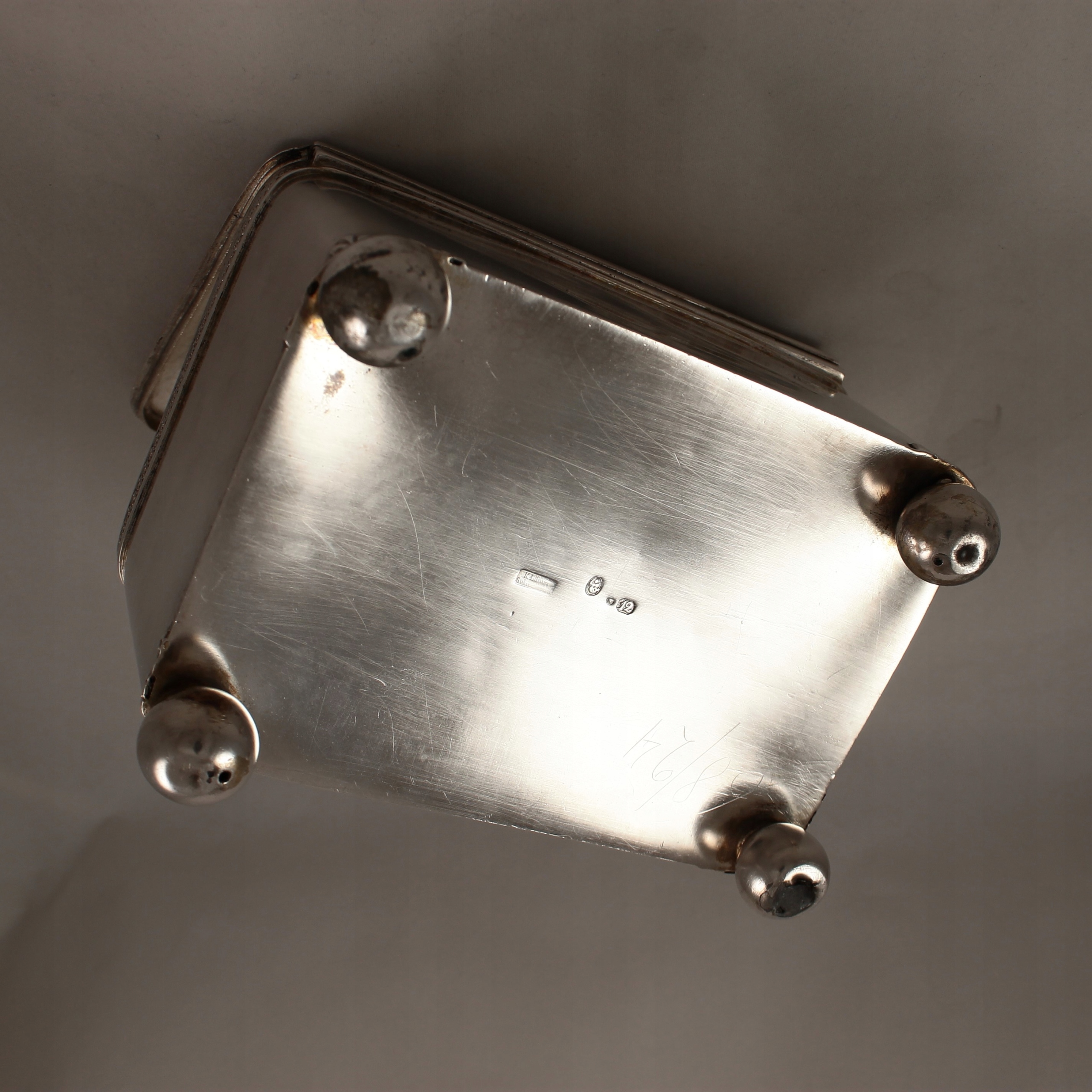 Сахарница, корпус-шкатул, на 4 ножках в форме шара, крышка украшена бляшкой с рельефным мотивом играющих на инструментах херувимов, верхний край тулова опоясан лентой с рельефным мотивом пальметты, ключевой знак, украшенный табличкой с мотивом венка из листьев аканта.