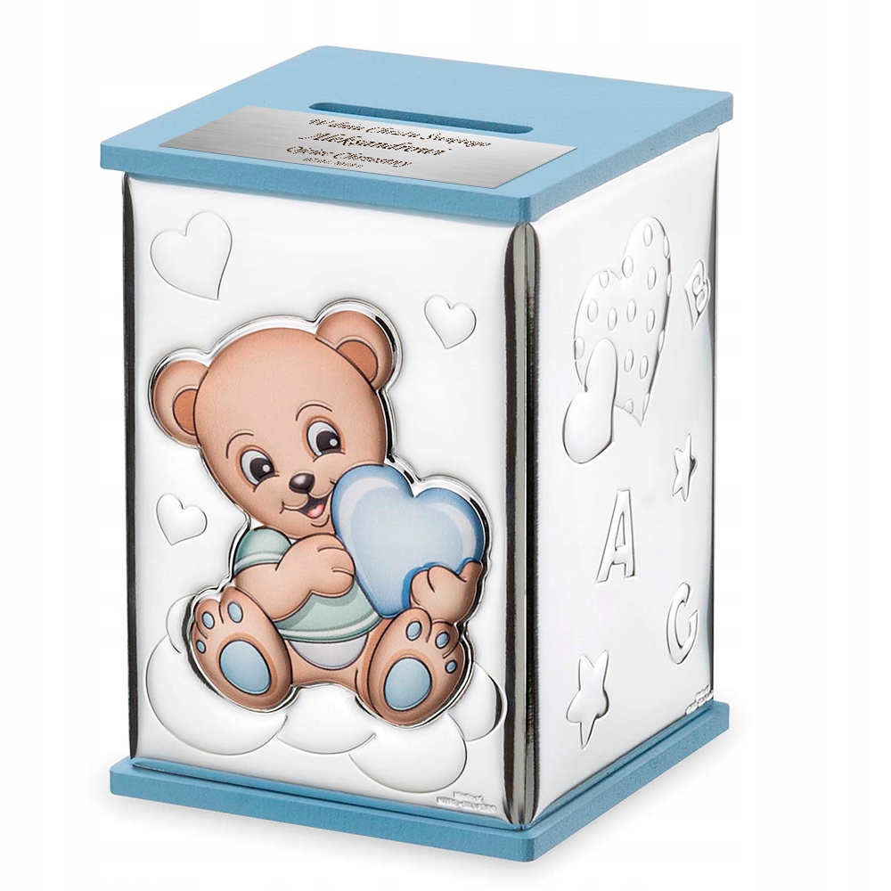 СЕРЕБРЯНАЯ копилка с мишкой на крещение 8 х 8 х 11,5 см синяя