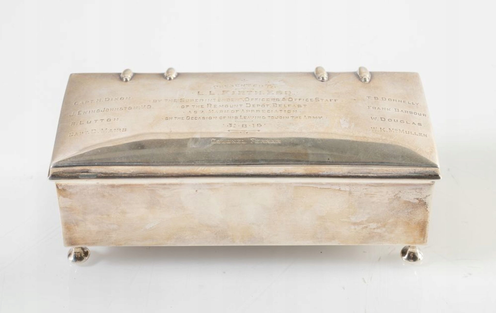 Серебряная шкатулка с деревянным основанием и внутренней частью.