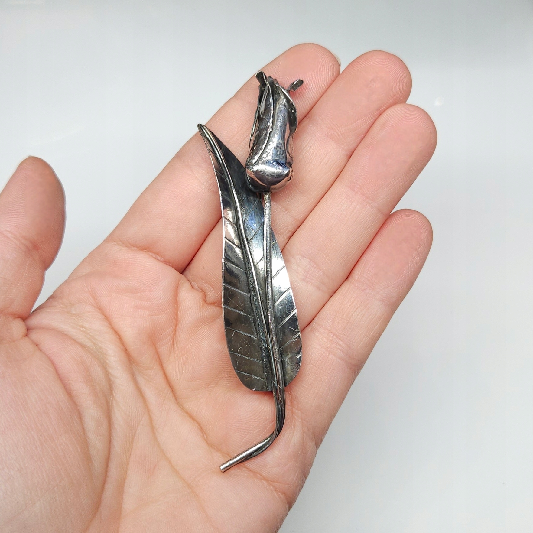 Предмет продажи — продолговатая серебряная брошь в форме цветка с листиком.
