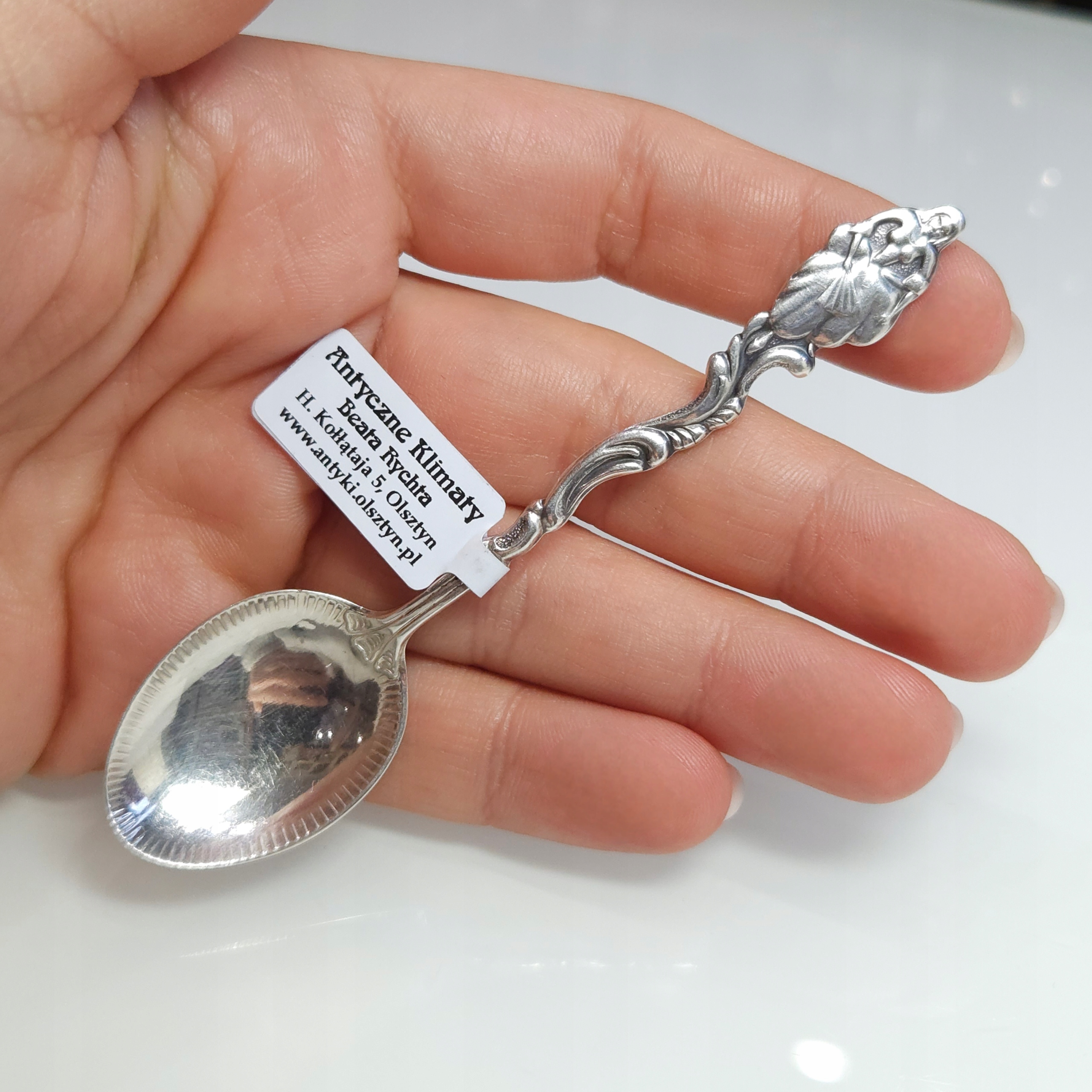 Предмет продажи — серебряная ложка мокко с декоративным черпаком и ручкой, украшенной мотивом женщины с веером