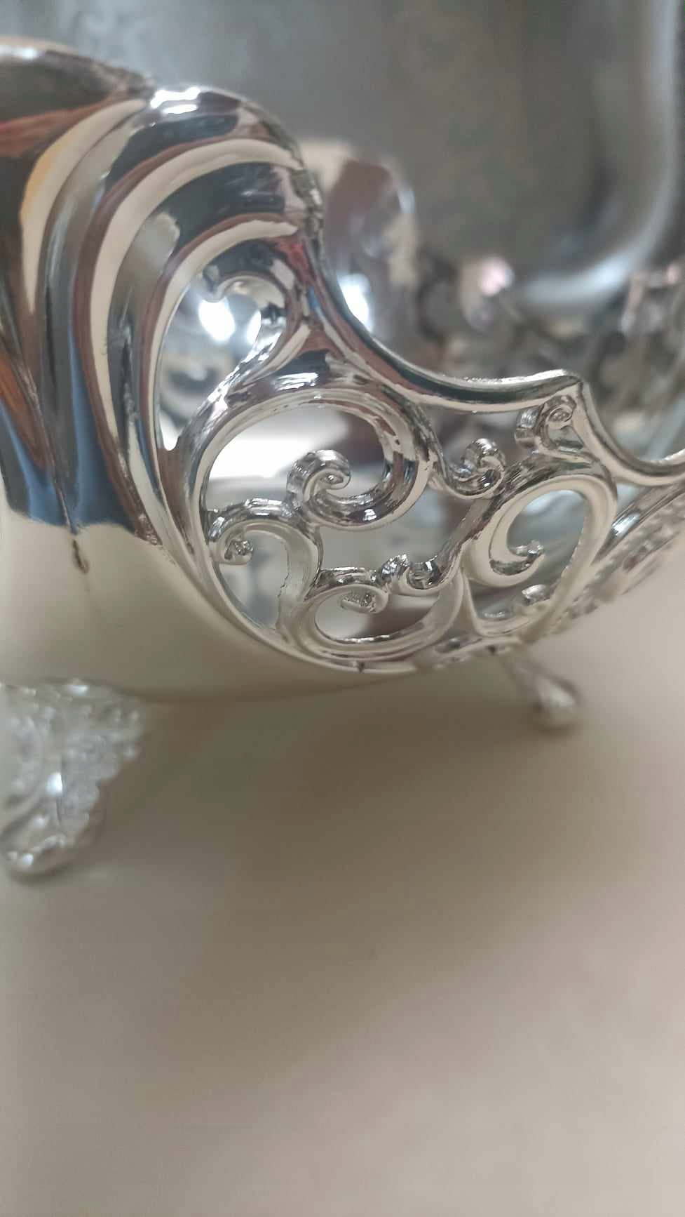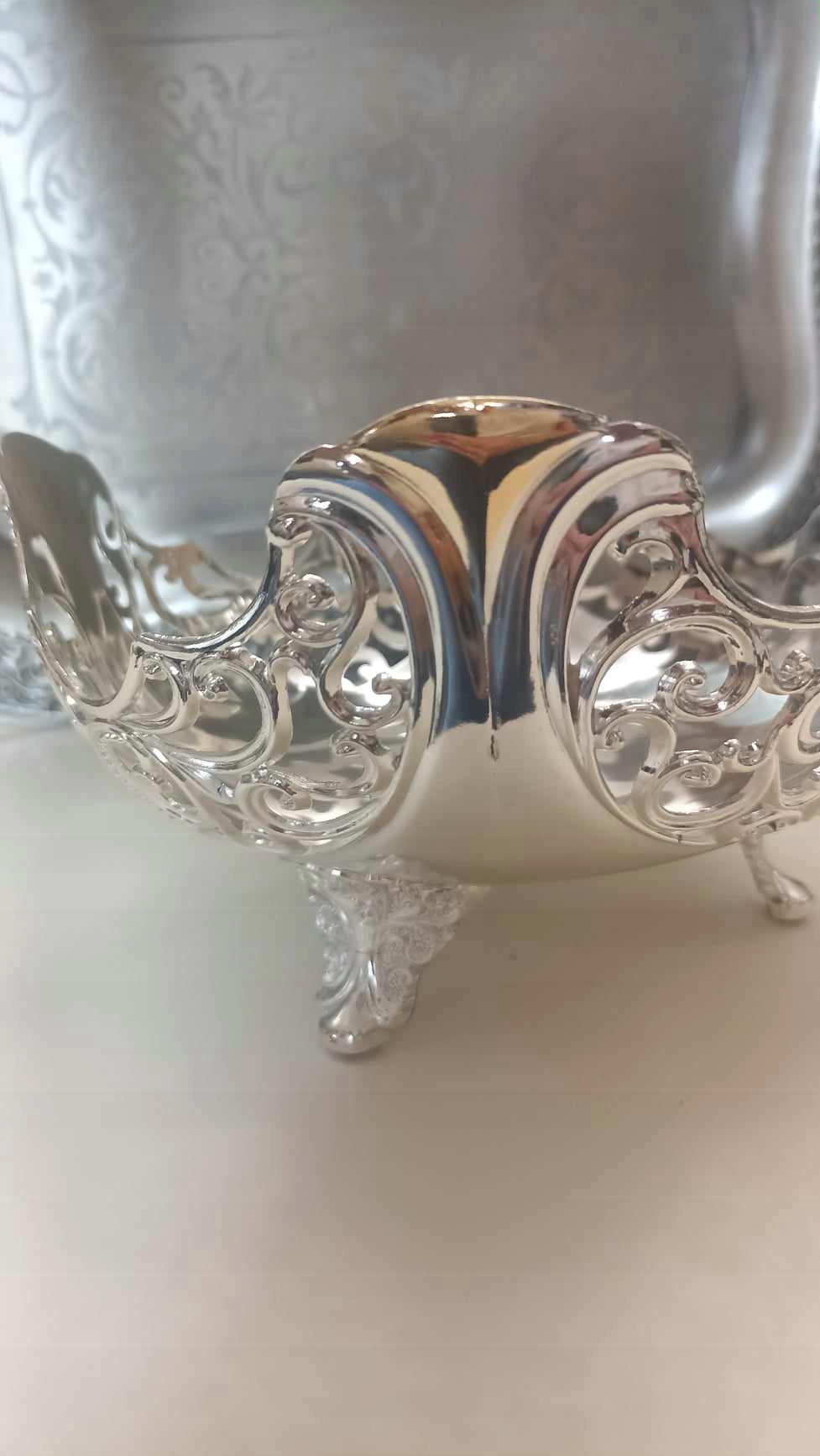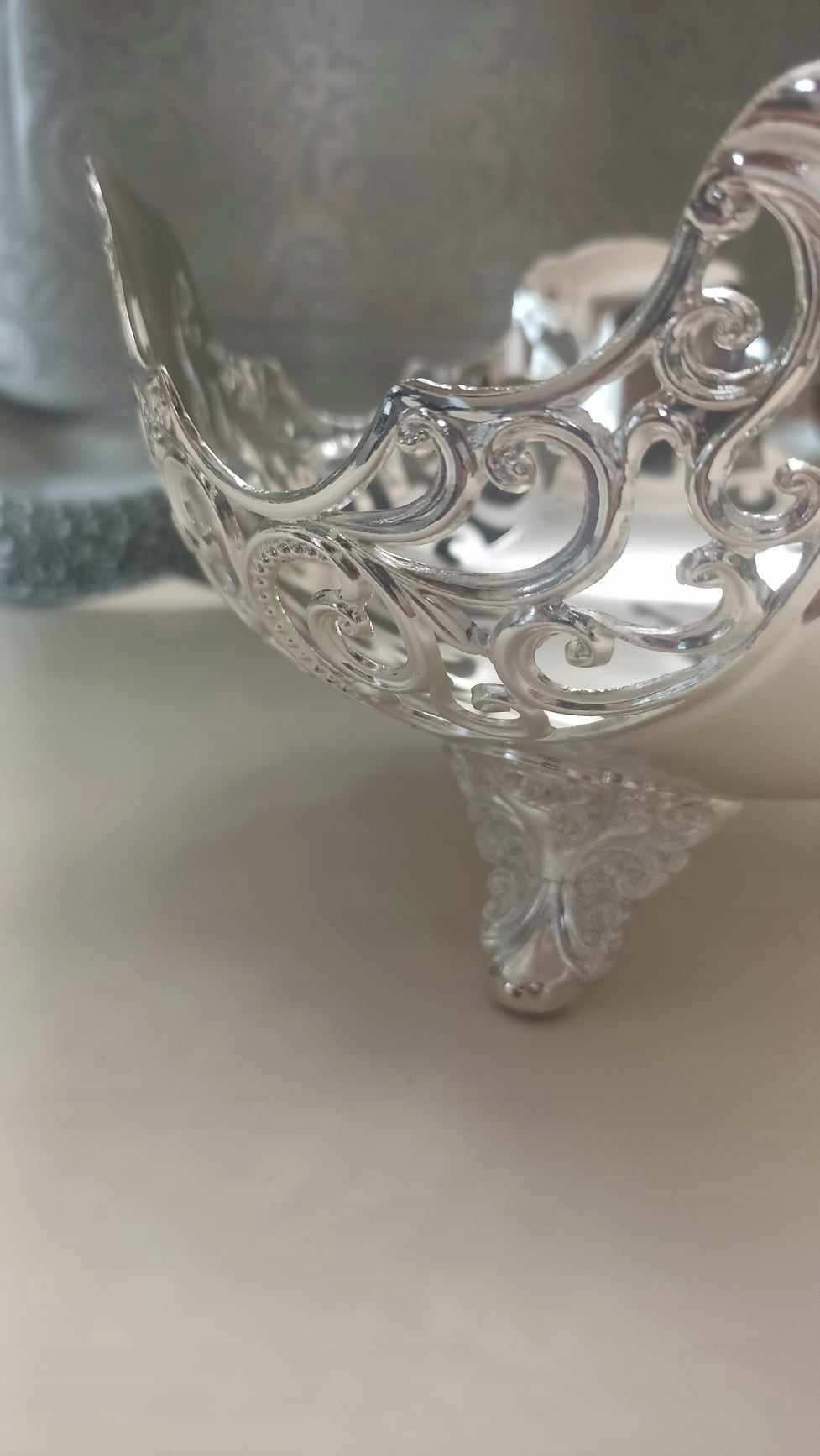 Украшение для вашего дома-прекрасная миска. Изготовлен из высококачественного металла, который был покрыт тарелкой. Plater - это покрытие, которое дает цвет и долговечность объекту. Платер защищает металл от неблагоприятных условий (вода, водяной пары), которые могут вызвать коррозию металла. Предметы с покрытием покрытия всегда служат в течение длительного времени. Внимание обращает на красивые украшения, выбитые в виде открытых работ. Четыре границы увенчаны золотой вставкой. Чаша кажется легкой, благодаря трем тонким ногам. По -прежнему по -прежнему врезается в настойчивый шаблон. Серебряное покрытие завершено до высокого глянцевого. В будущем вы можете легко расширить набор с другими элементами.