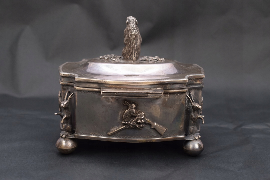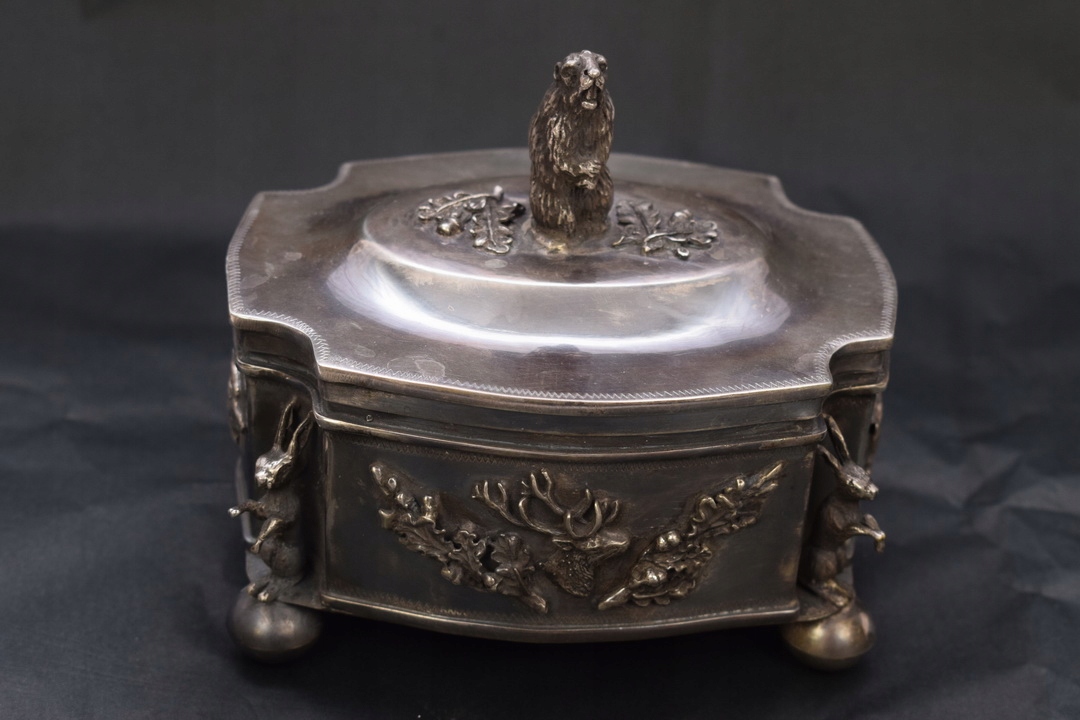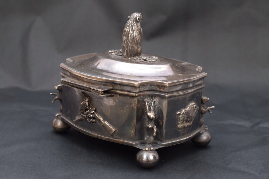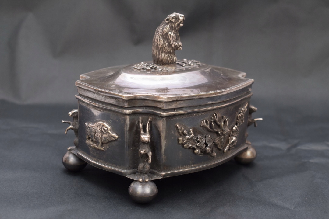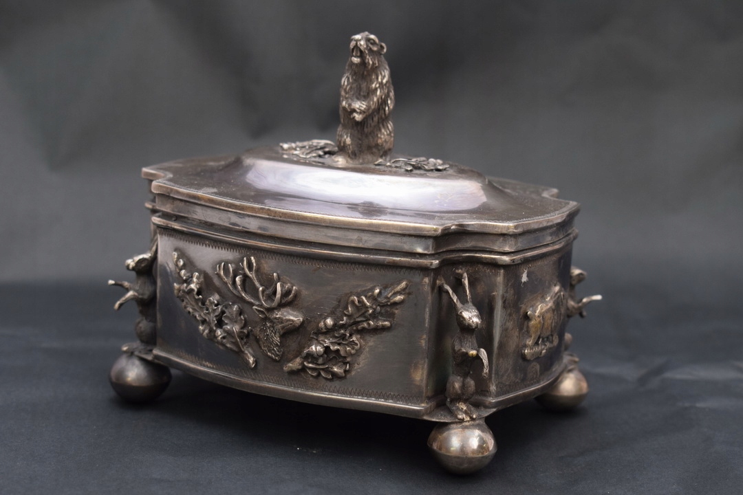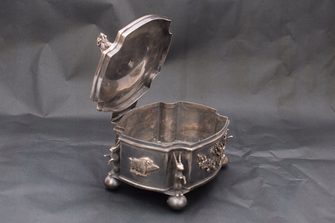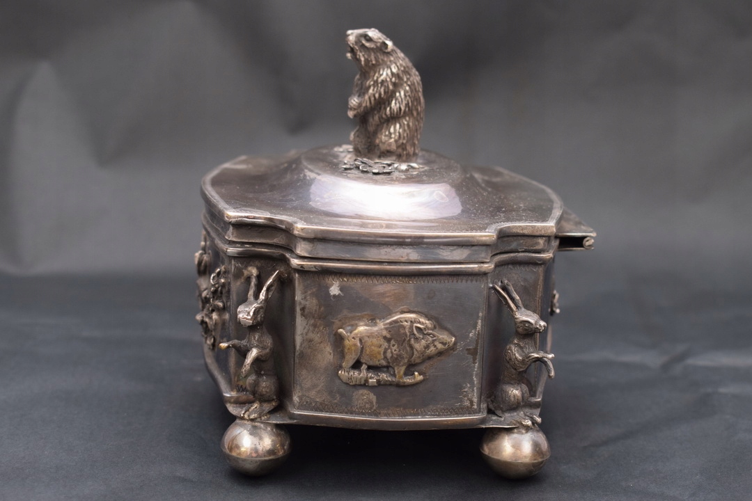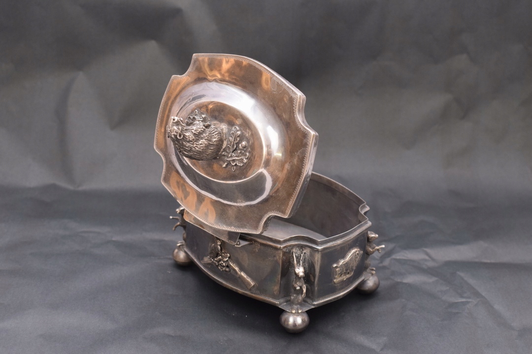 Красивая шкатулка 19 века- типа сахарницы, поддерживаемой на четырех ножках профилированной крышкой, закрепленной на шарнире. Крышку сахарницы венчает опасный кабан – тоже из серебра. Серебро чрезвычайно богато гравировано. По бокам сахарницы имеется множество украшений.