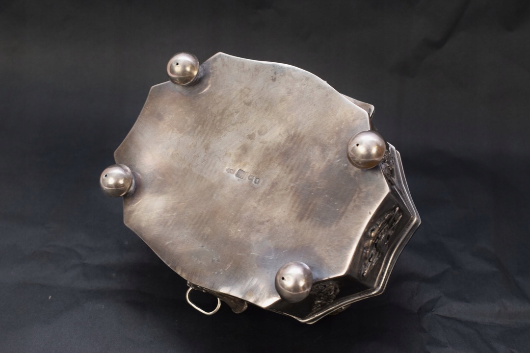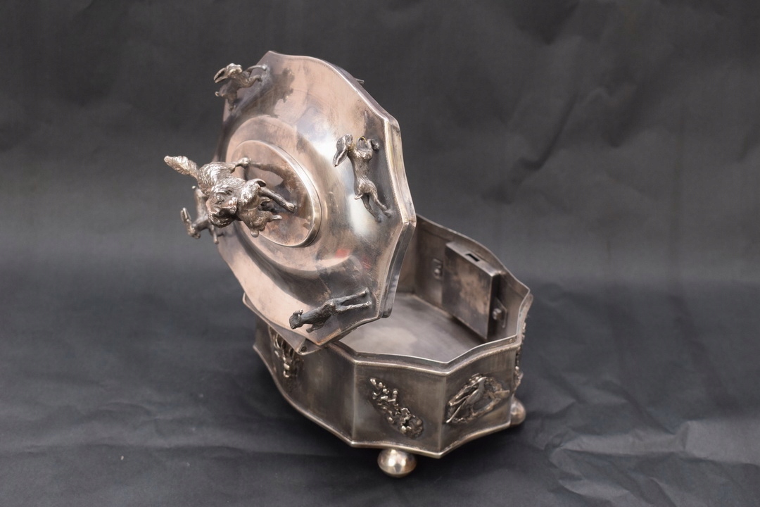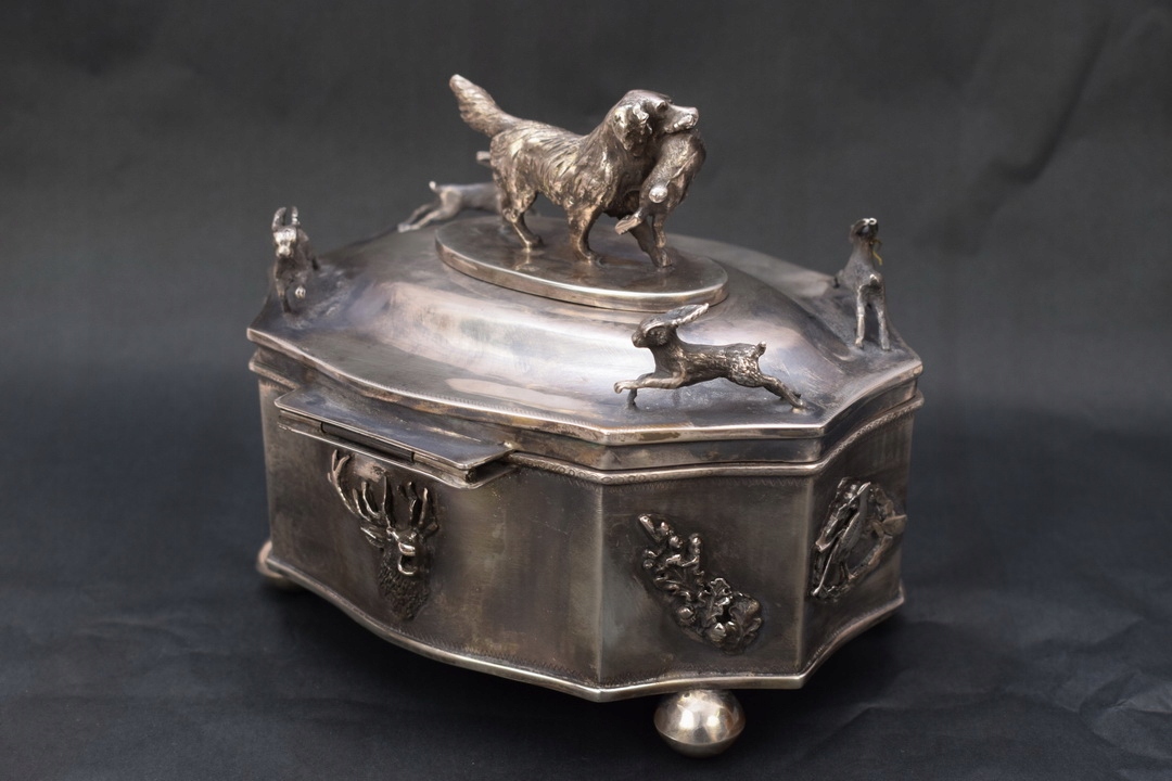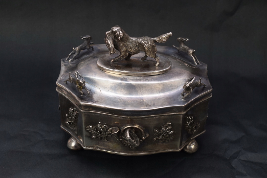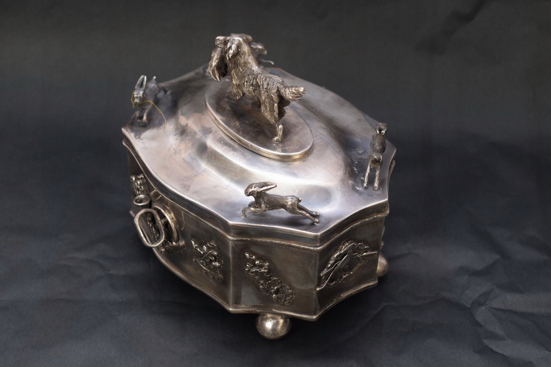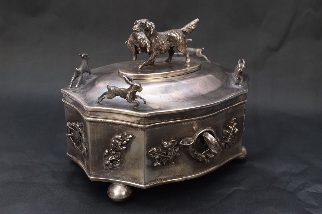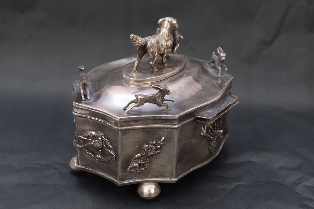 Красивая прямоугольная сахарница XIX века на четырех ножках с профилированной крышкой, закрепленной на шарнире. Крышку сахарницы венчают величественные ОХОТНИК и глухари - тоже из серебра. Серебро чрезвычайно богато гравировано, внутренняя часть полирована позолотой. По бокам сахарницы имеется множество серебряных украшений.