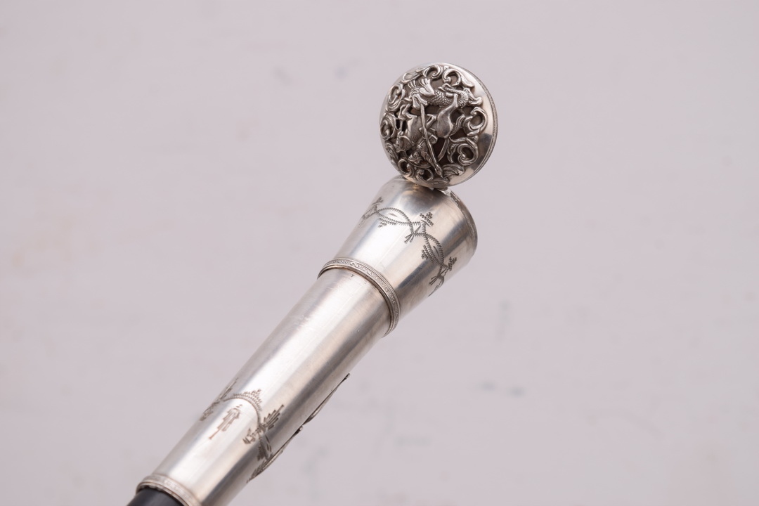 Переднюю часть посоха венчает царский герб, наверху - Святой. Георгий на коне.