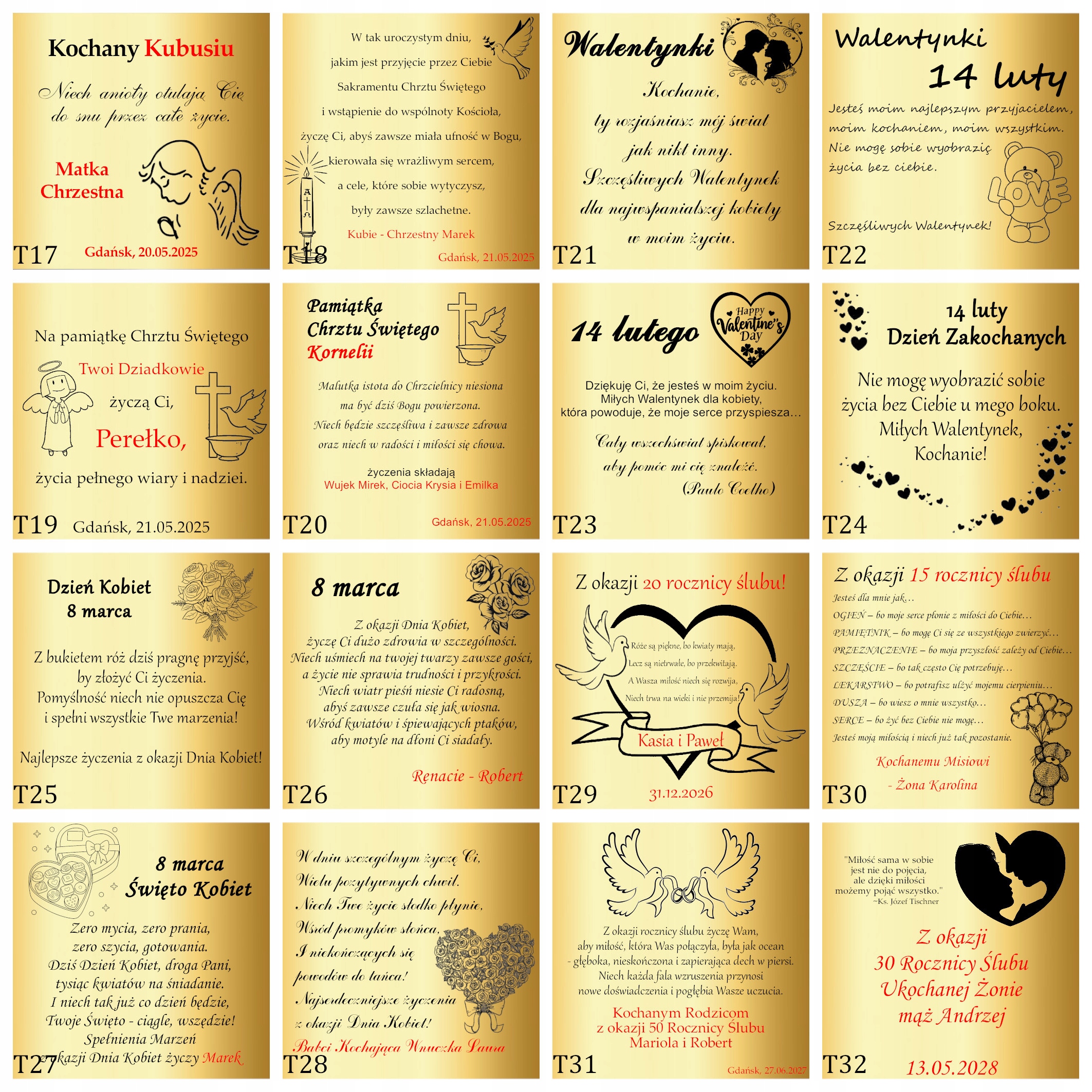 Если вы хотите выбрать один из готовых шаблонов, при оформлении заказа укажите номерной знак и данные, на которые мы должны заменить красные фрагменты текста, например. табличка T17, Мацюс, Ала Чочия, Варшава, 15 марта 2021 г. Мы выгравируем пожелания, изложенные на табличке T17, с предоставленными вами данными.
