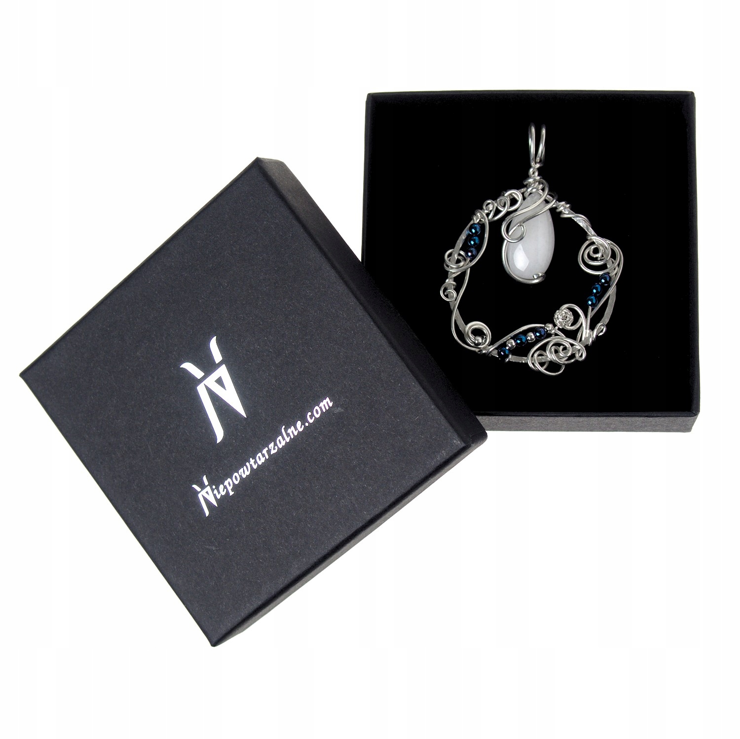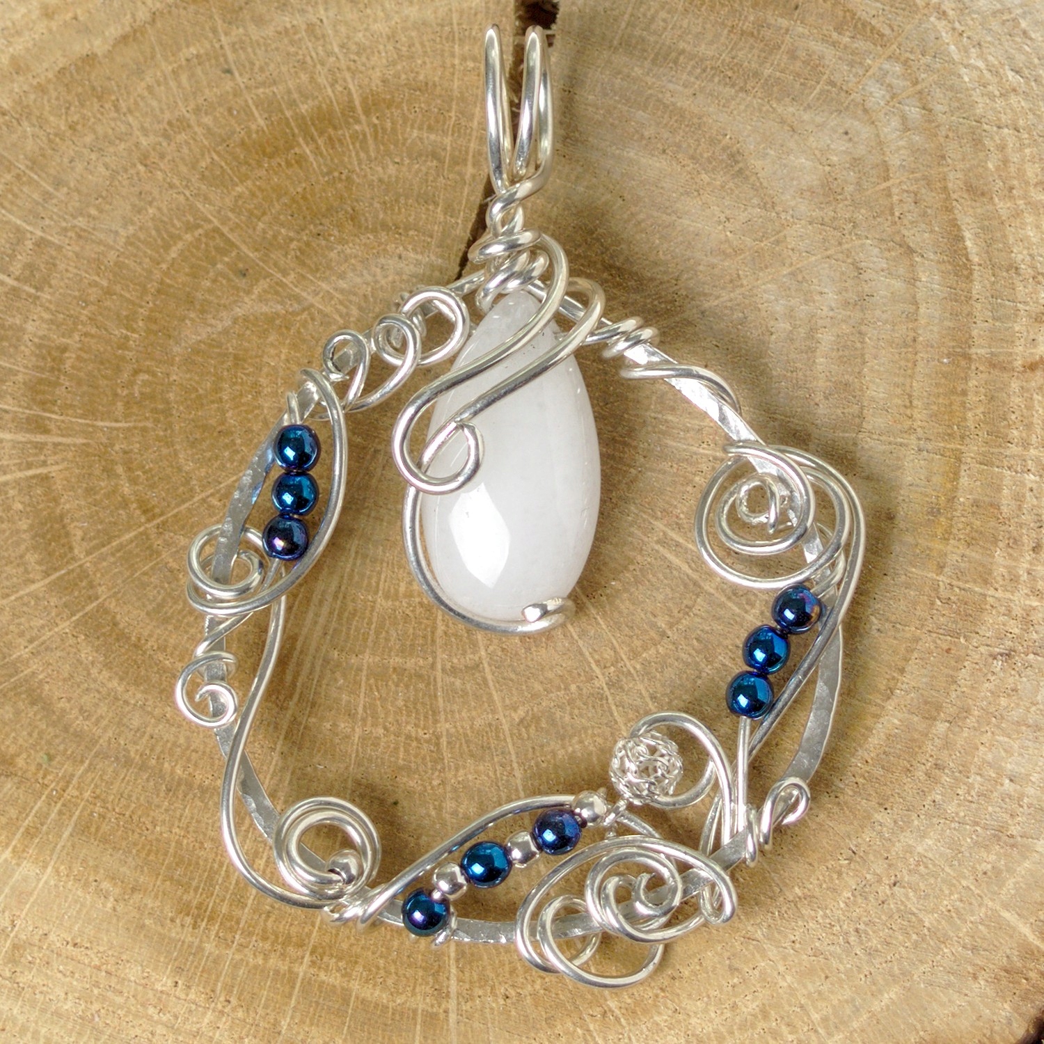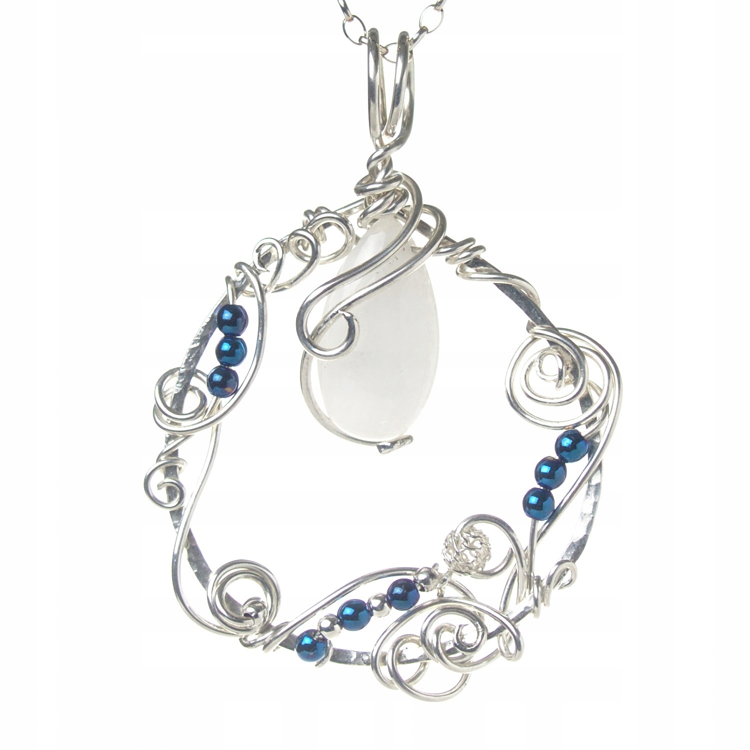 - Камни: Нефрит , белая гладкая капля 22 х 12 мм и 9 х синих, блестящий гематит, гладкий шарик 3 мм.