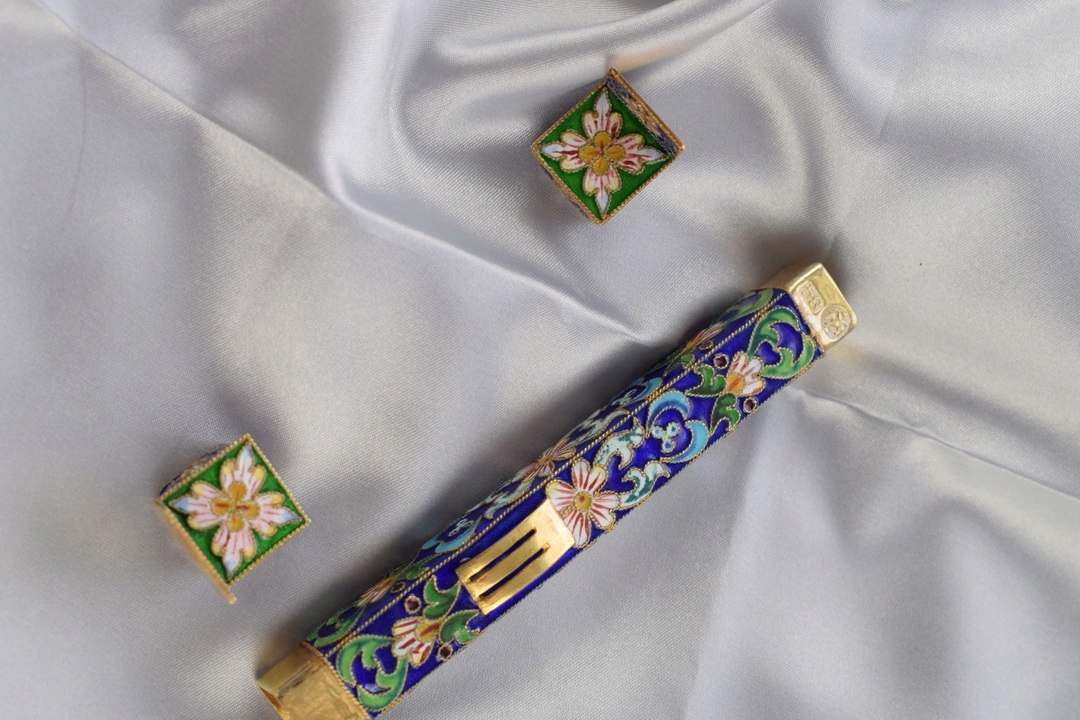 Серебро, сплошь густо позолоченное, украшенное вокруг разноцветной ячеистой эмалью.
