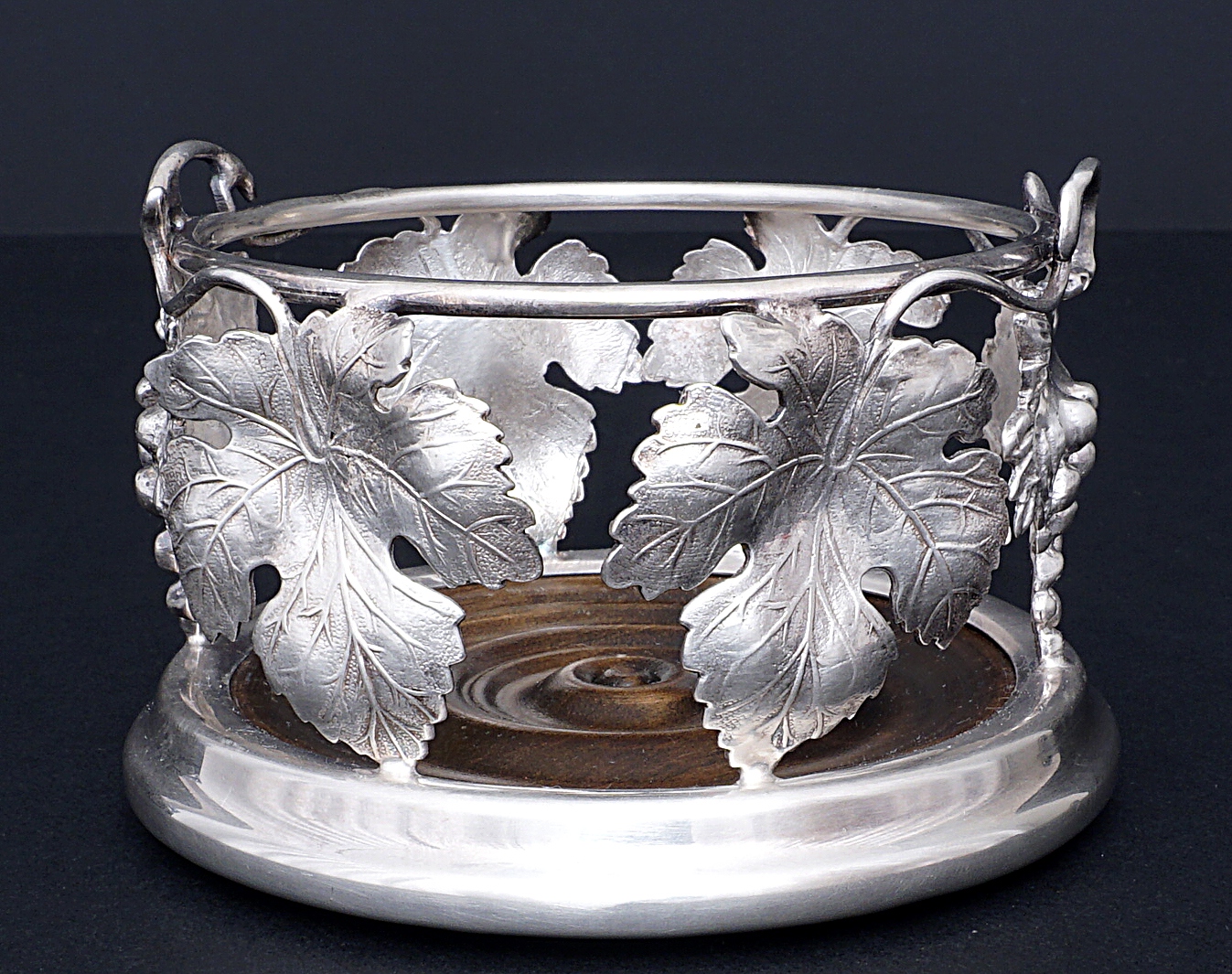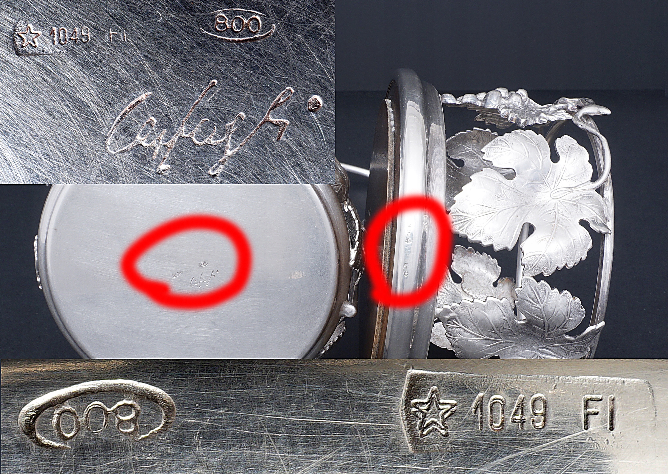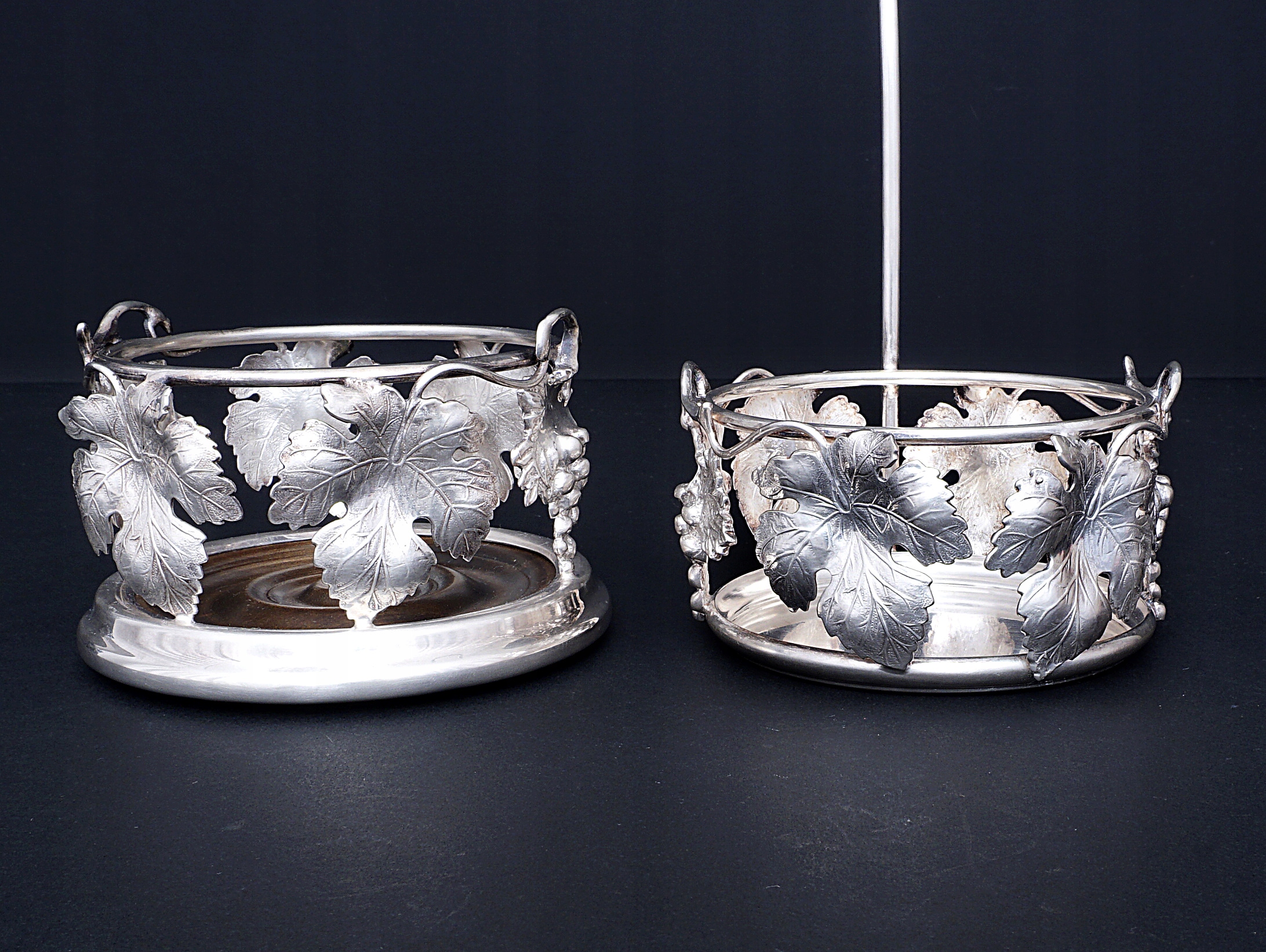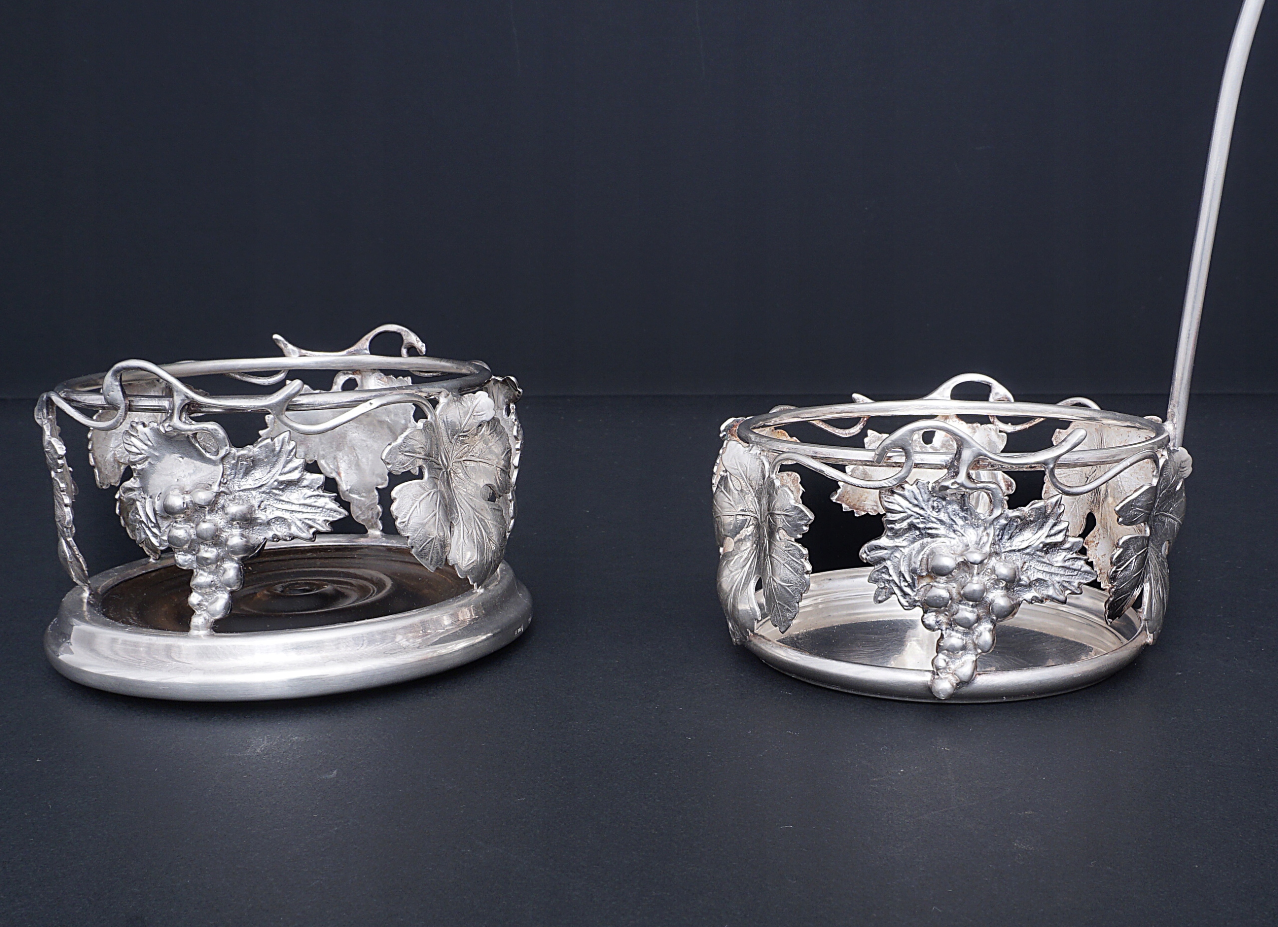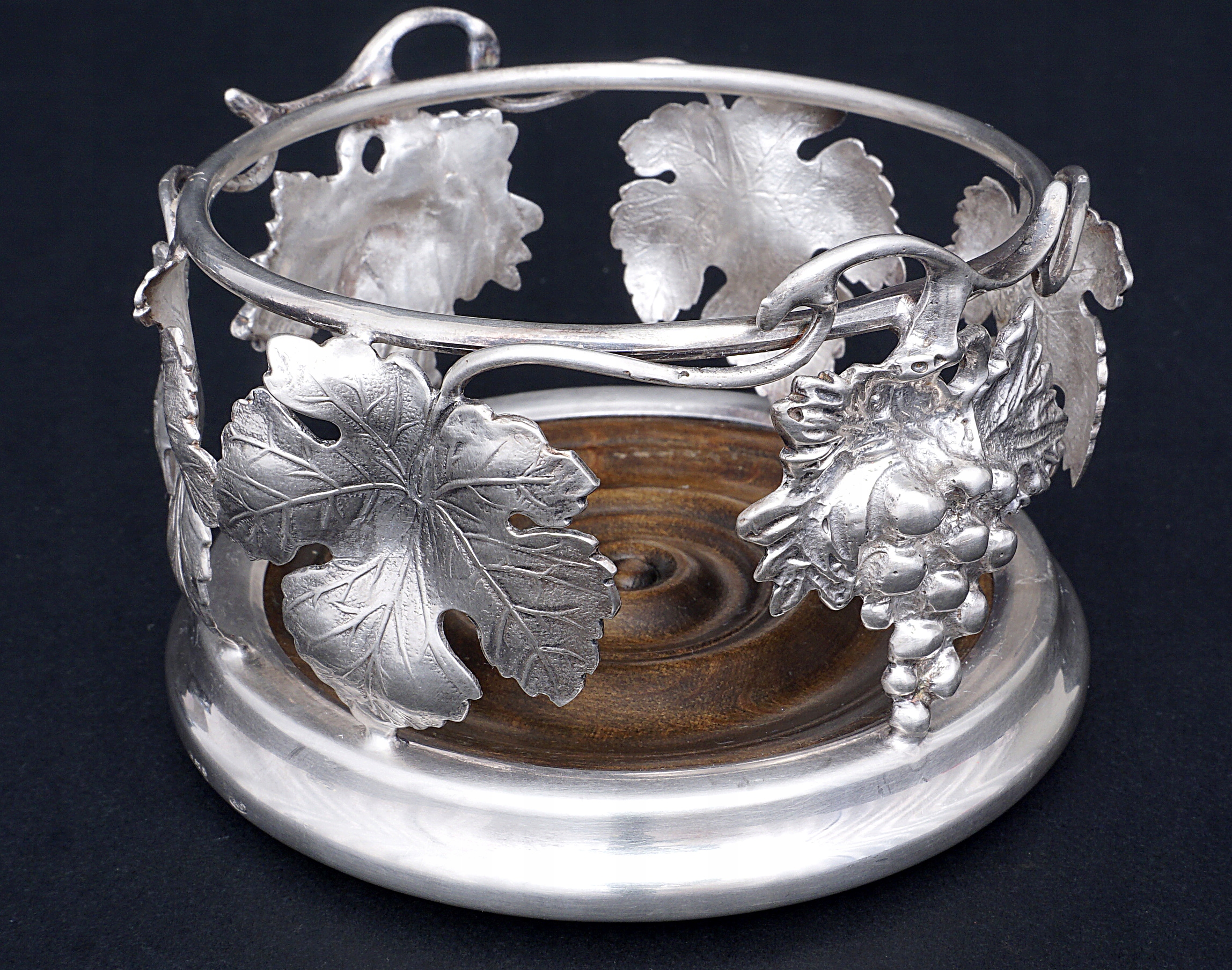 изготовлены из 800/1000 серебра. Дно подставки деревянная, а подставка полностью серебряная.