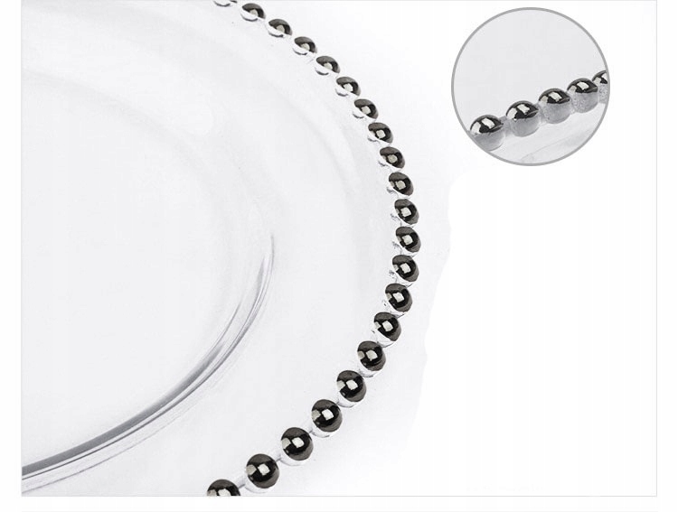 Прозрачная стеклянная подставка украшена по краям серебряными жемчужинами. Детали серебряной отделки придают ему изысканный и элегантный характер.