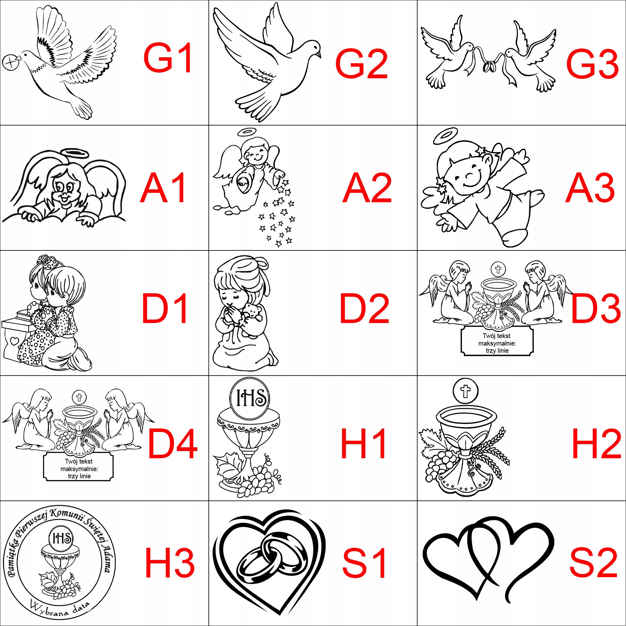 Возможно выполнение дополнительной гравировки рядом с текстом в соответствии с таблицей рисунков ниже. Пожалуйста, укажите выкройку в сообщении продавцу (G1, A1 и т. д.)