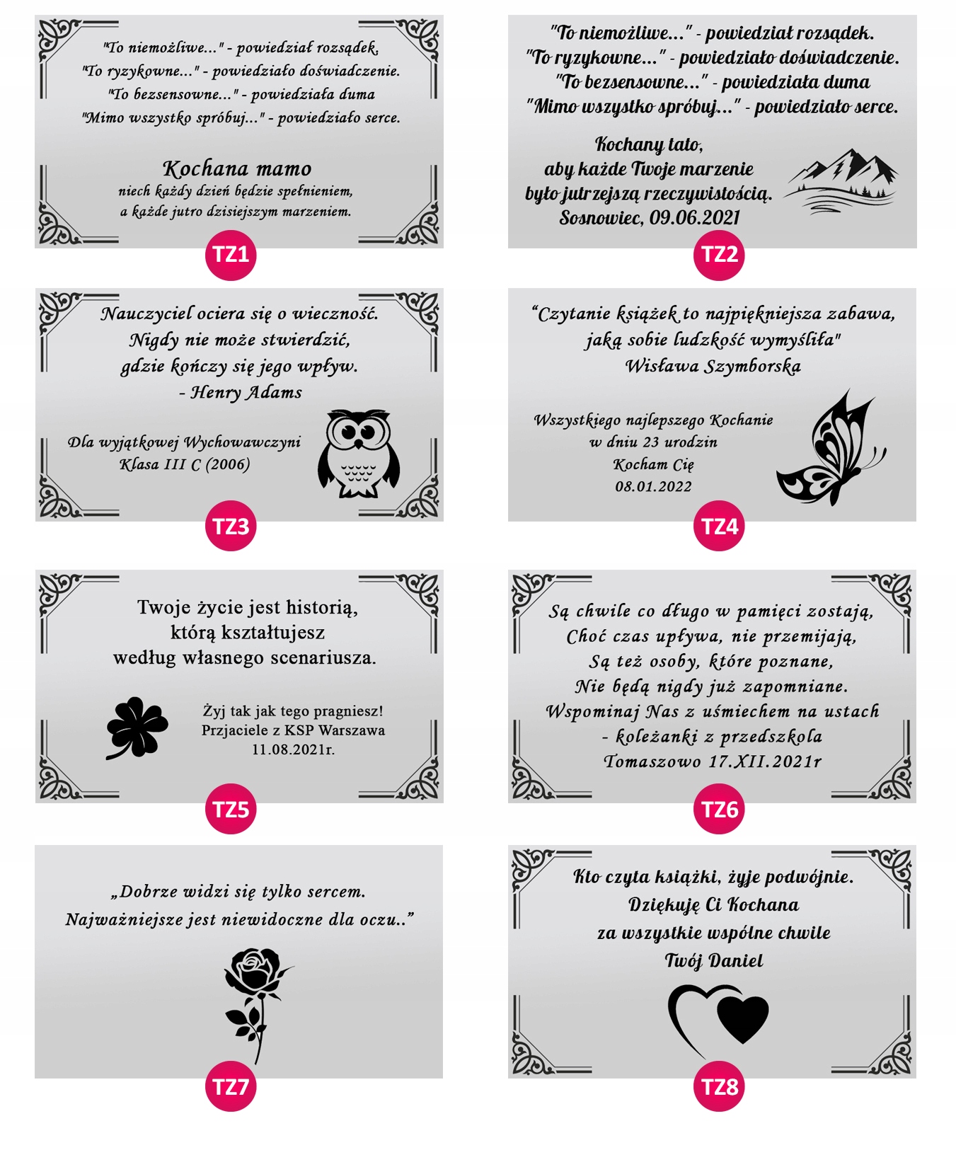 Если вы хотите сделать посвящение по одному из представленных проектов, сообщите нам в сообщении, какой дизайн вам понравился! Если вы отправите только текст, мы сделаем посвящение без дополнительных украшений и символов.