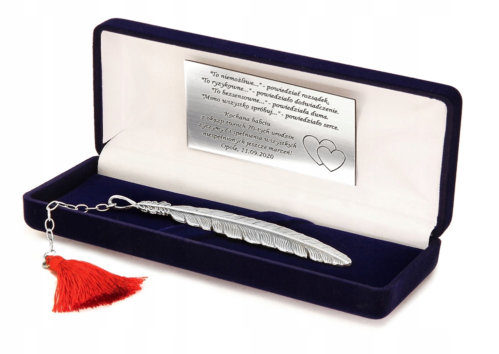 Предлагаемый товар представляет собой закладку с подвесной кисточкой, выполненную полностью из серебра 925 пробы высочайшего качества. Закладка была разработана так, чтобы на оборотной стороне было посвящение получателю. Гравировка выполняется лазерным методом, что гарантирует высокую точность и долговечность, делая текст разборчивым.