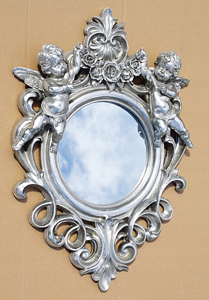 Красивое, эффектное зеркало с фантастическим ажурным декором и амурами в старинной серебряной раме.