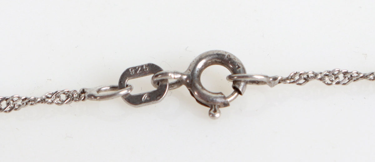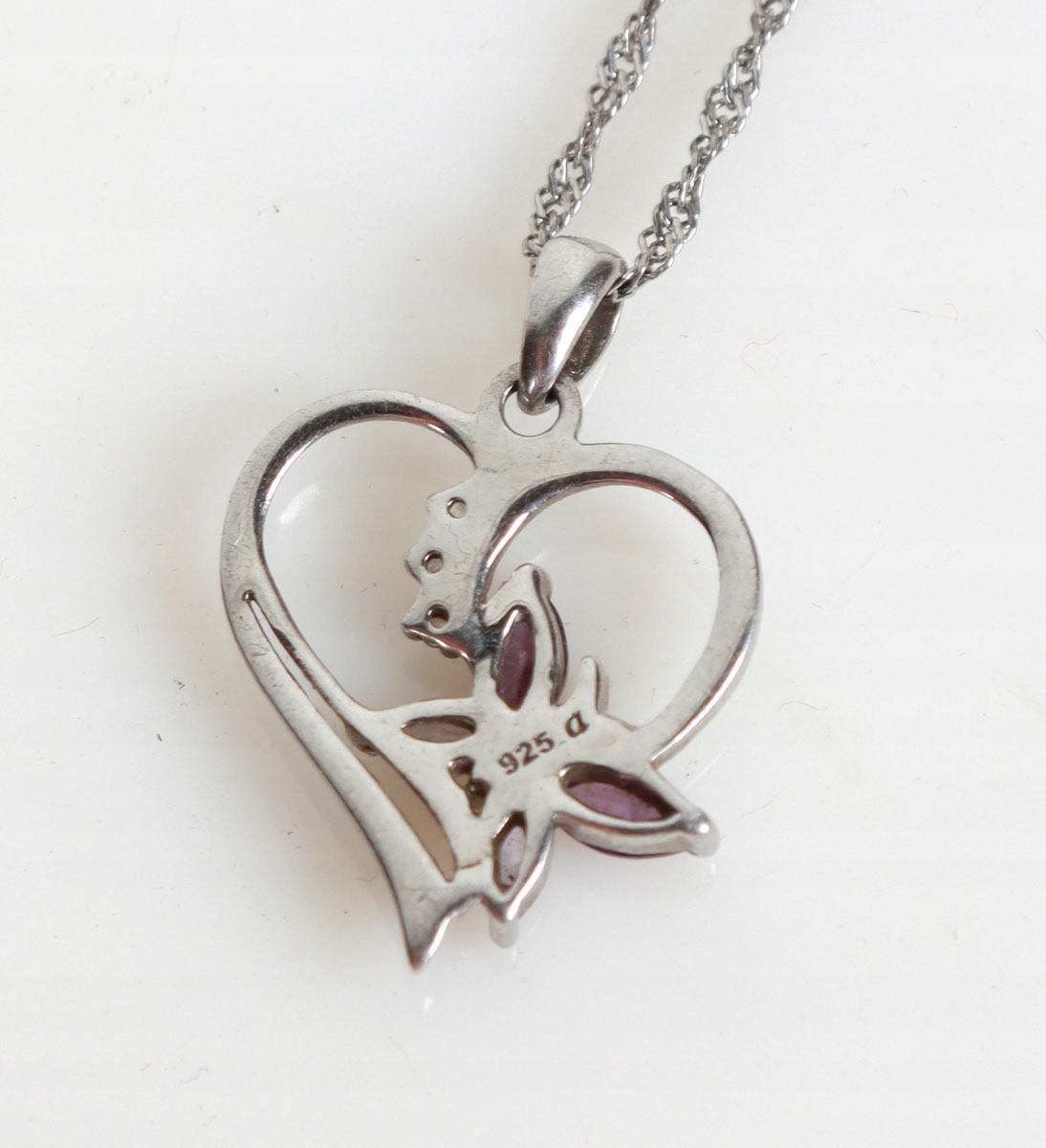 Колье из серебра 925 пробы. Ожерелье увенчано подвеской в форме сердца, в нижней части сердца бабочка, украшенная двумя аметистами и двумя горными кристаллами.