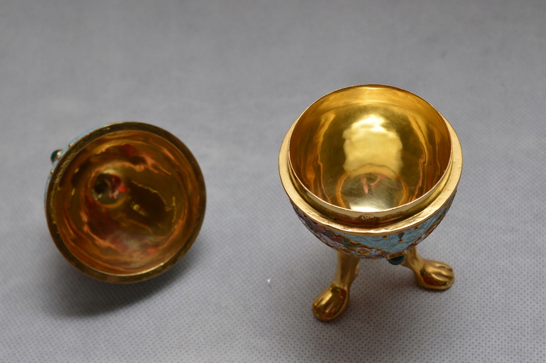 Серебряное, сплошь густо позолоченное, украшенное вокруг разноцветной ячеистой эмалью.