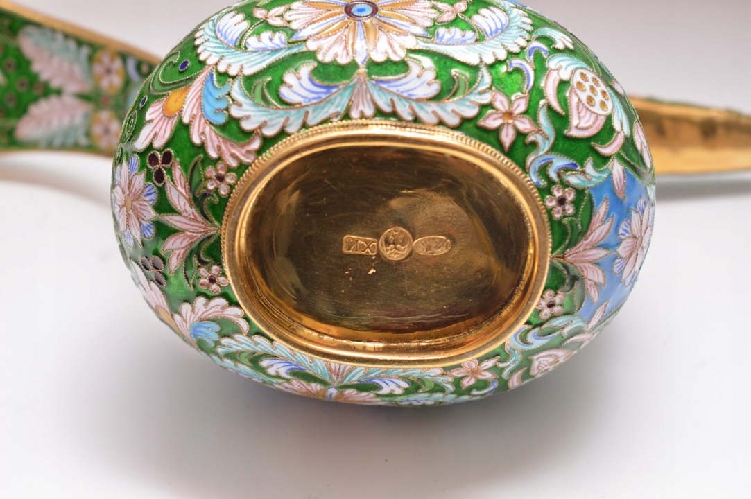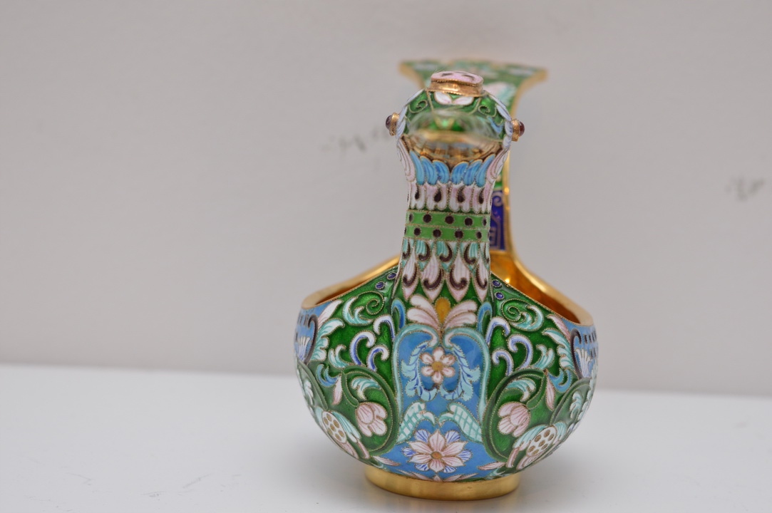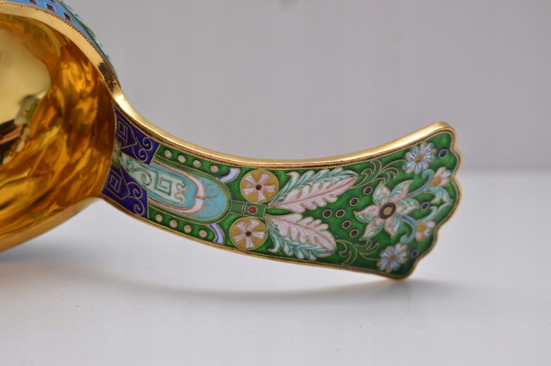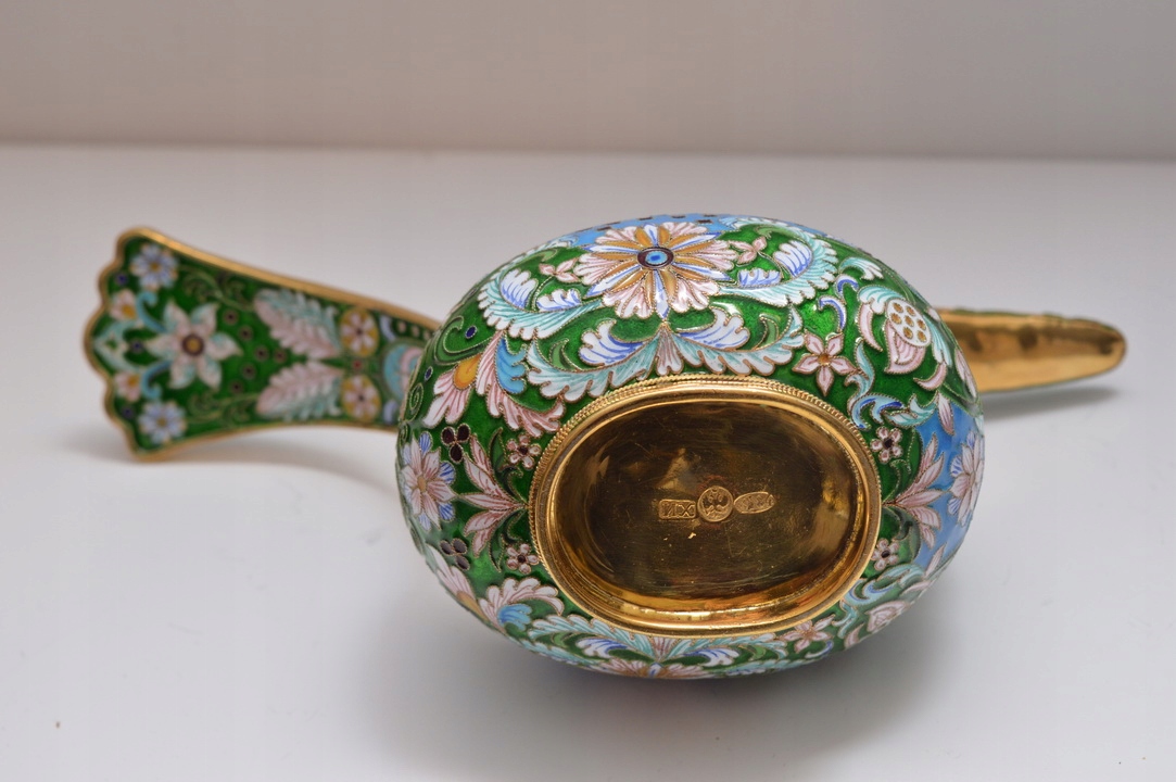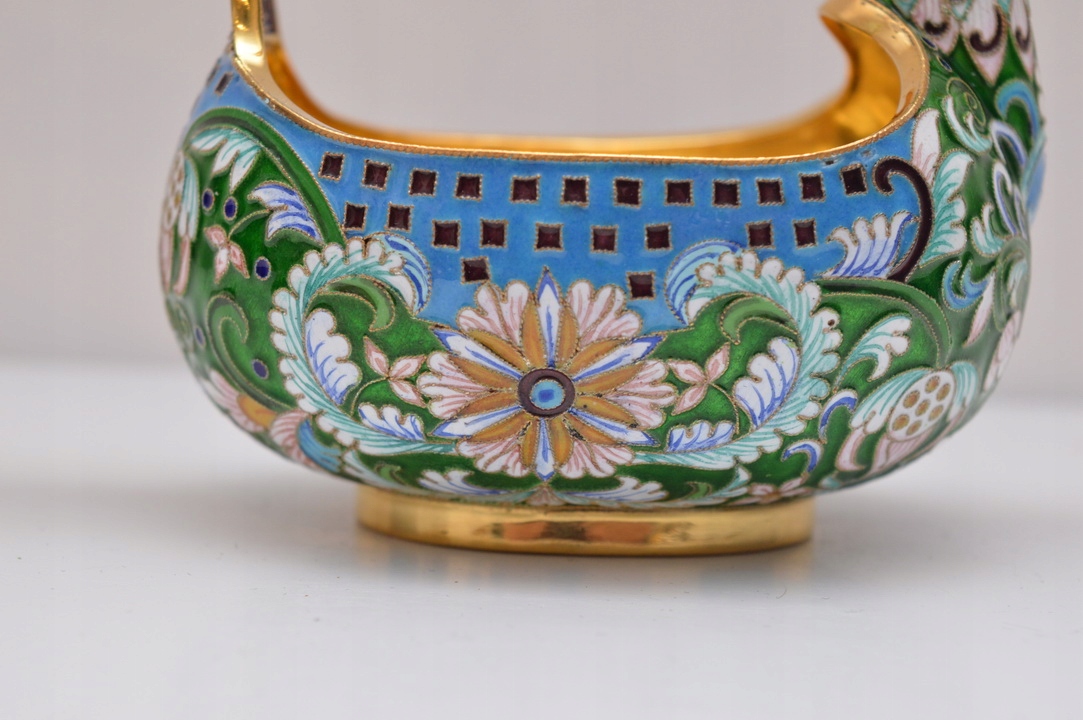 Серебро полностью позолочено, вокруг украшено разноцветной ячеистой эмалью.