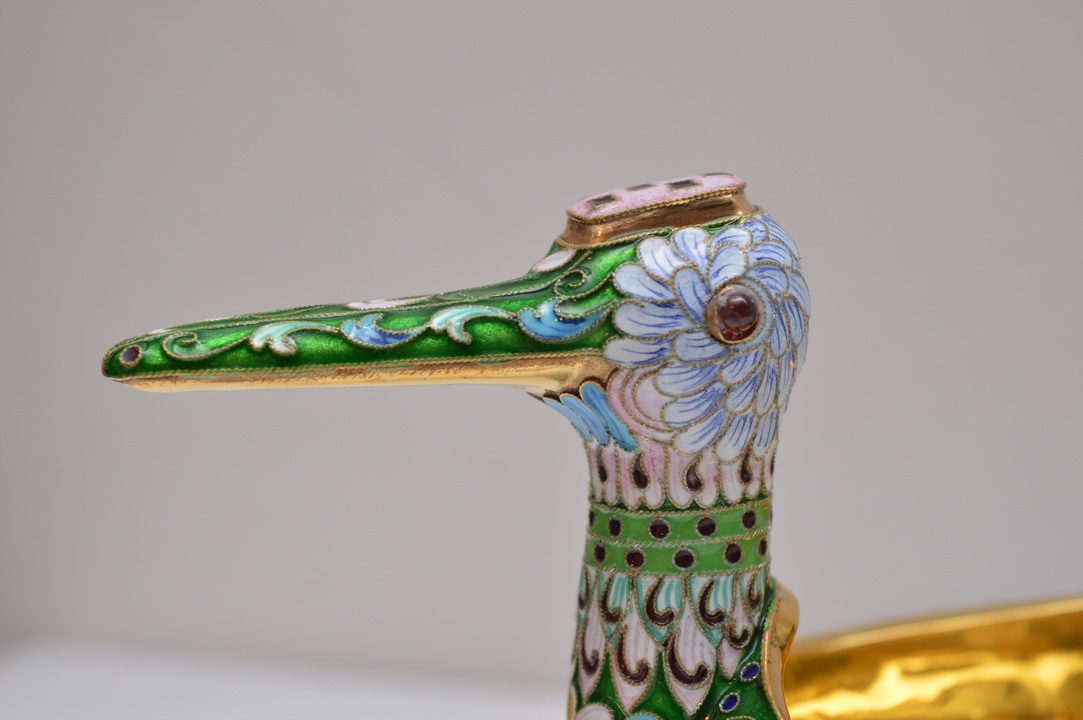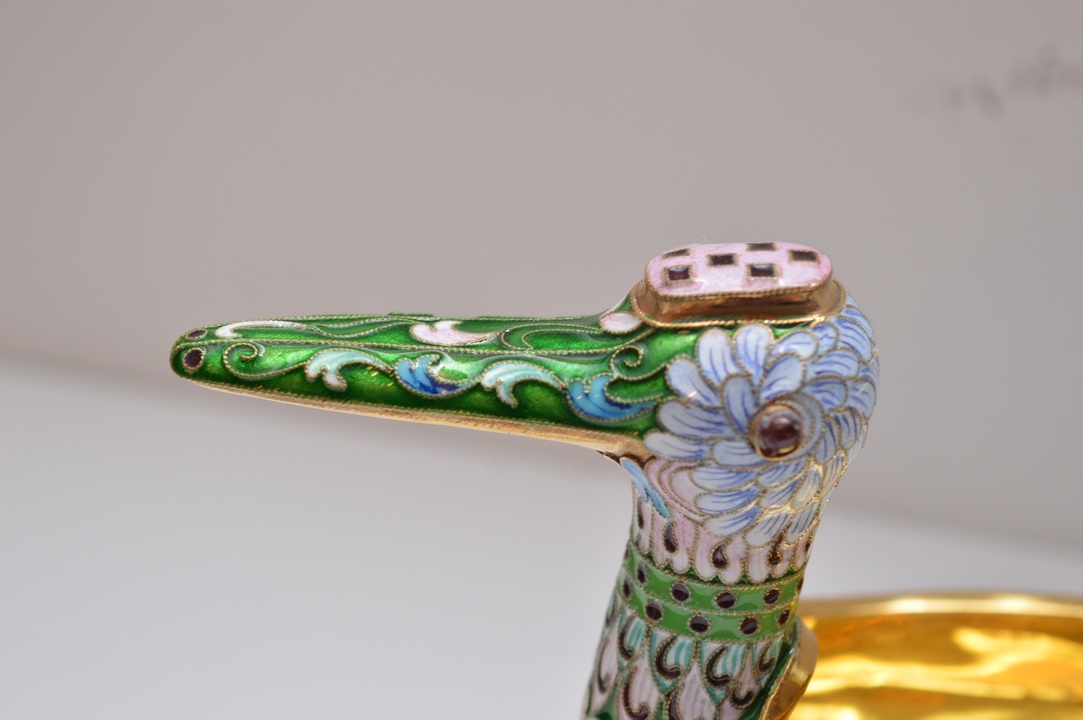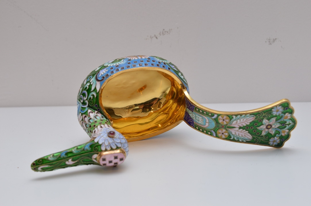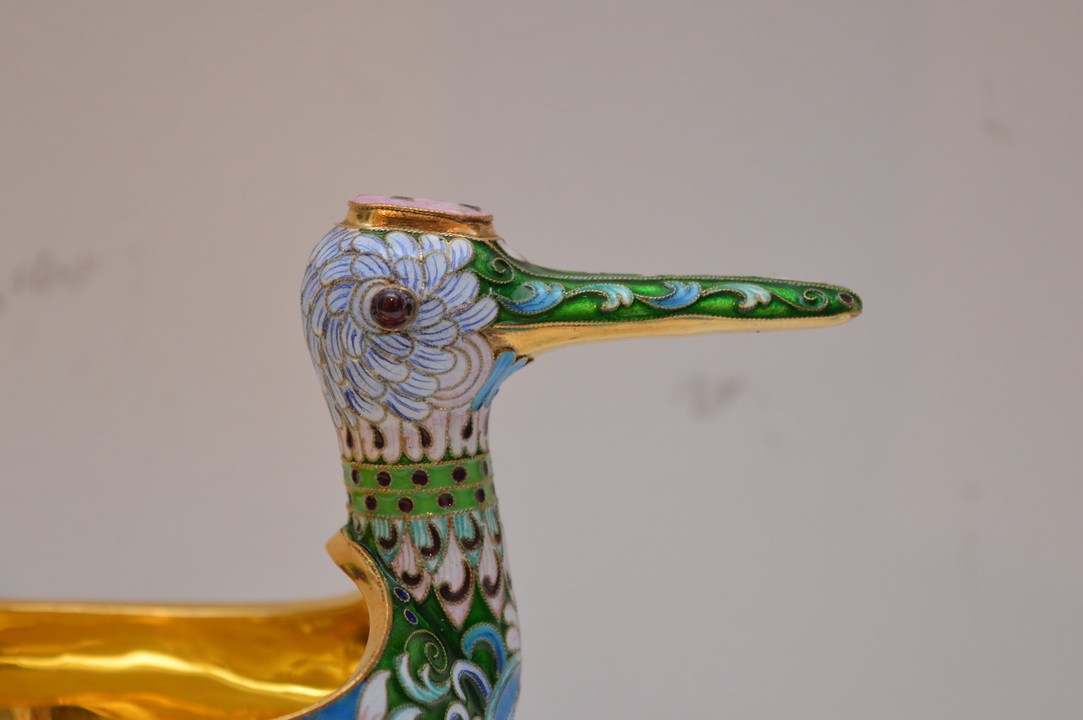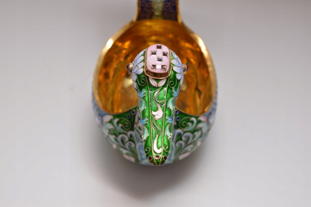 Серебро полностью позолочено, вокруг украшено разноцветной ячеистой эмалью.