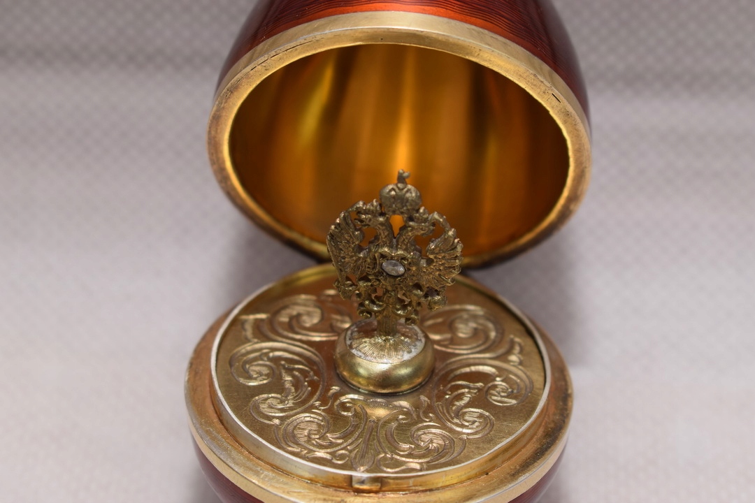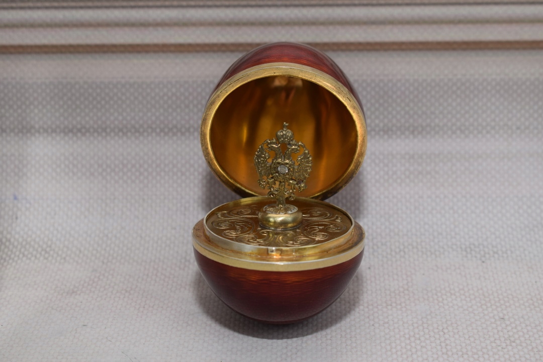 Это замечательное произведение истории, это 470-граммовое серебряное яйцо царской России – настоящее сокровище коллекционера, изготовленное из стерлингового серебра с изысканной позолоченной отделкой. Яйцо, украшенное ярко-красной эмалью, отражает элегантность и великолепие царской эпохи. Это яйцо, представляющее собой потрясающее сочетание мастерства и артистизма, стоит на серебряной подставке, призванной продемонстрировать его красоту. Внутри яйца двуглавый царский орел с бриллиантом.
