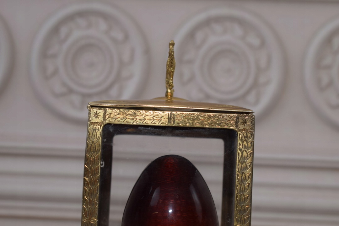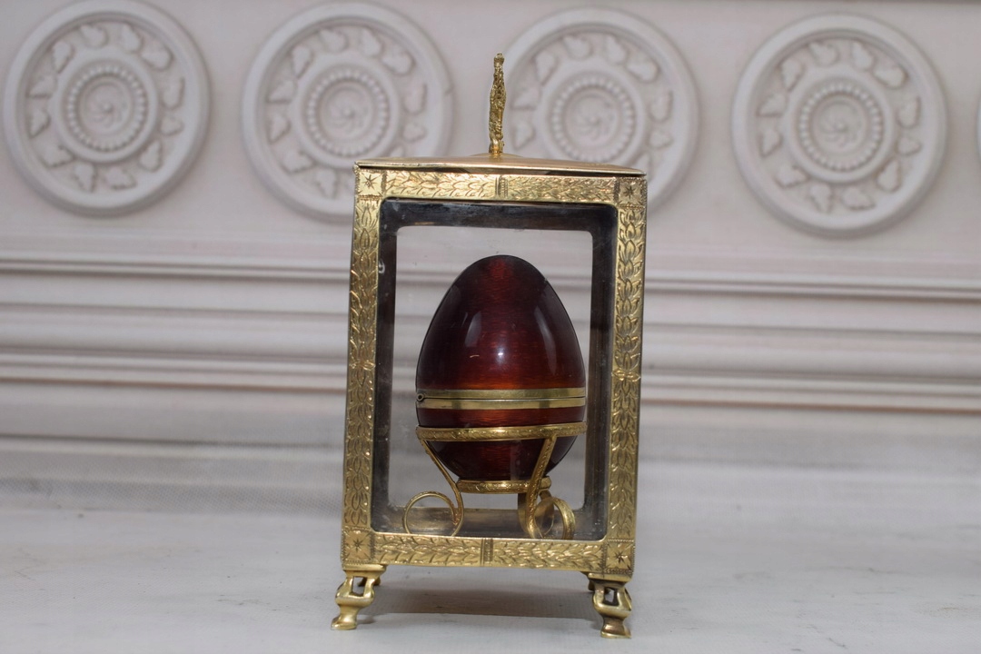 И яйцо, и витрина подписаны. Яркая красная эмаль в сочетании с позолоченной поверхностью делают это яйцо прекрасным образцом царского великолепия и настоящим символом роскоши.