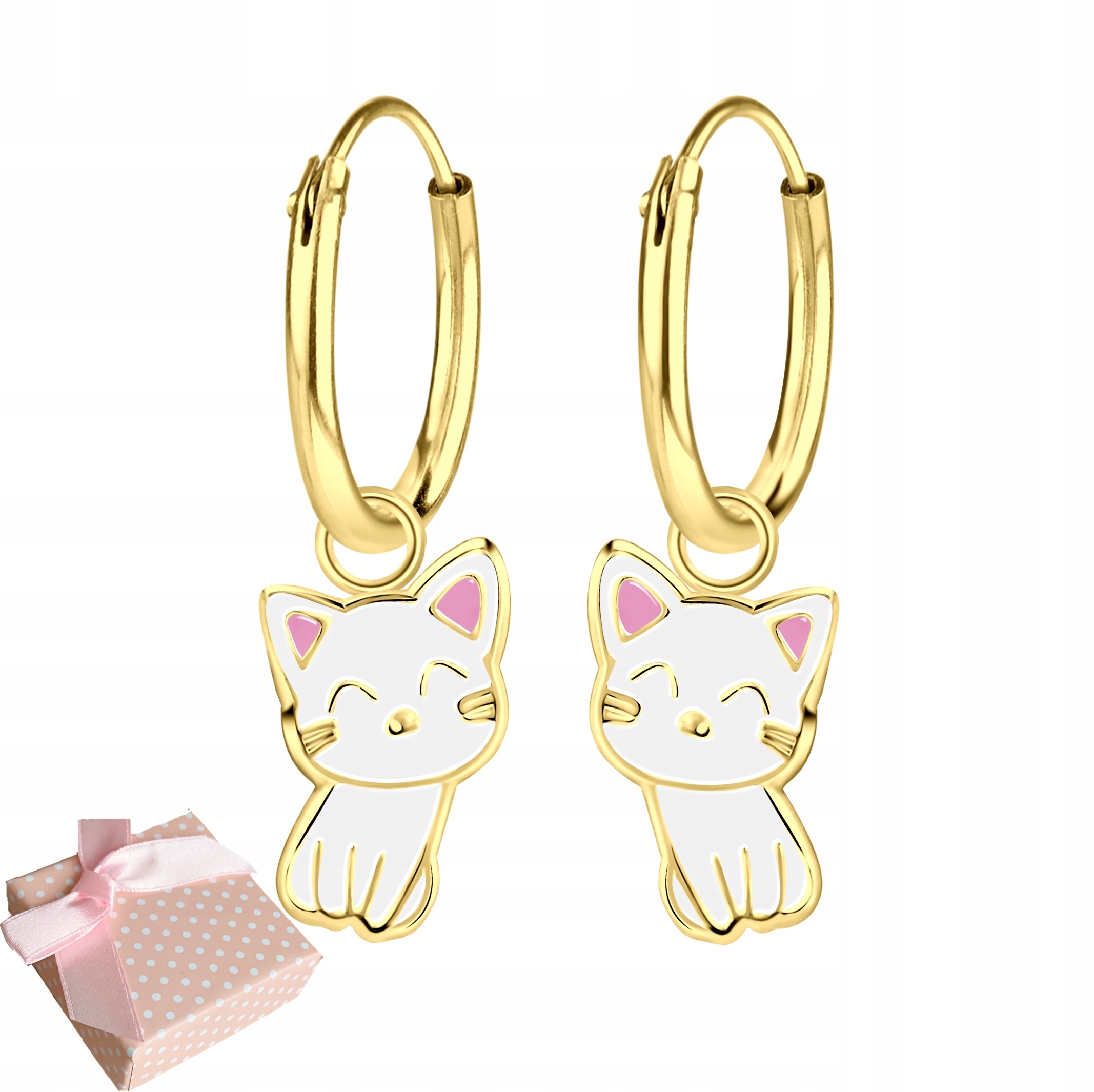 ✅ Красивые позолоченные серебряные серьги-обручи с котиками для девочек. Серебро 925 пробы, позолота с желтым золотом 14 карат. Колеса украшены подвеской в виде бело-розового котенка.