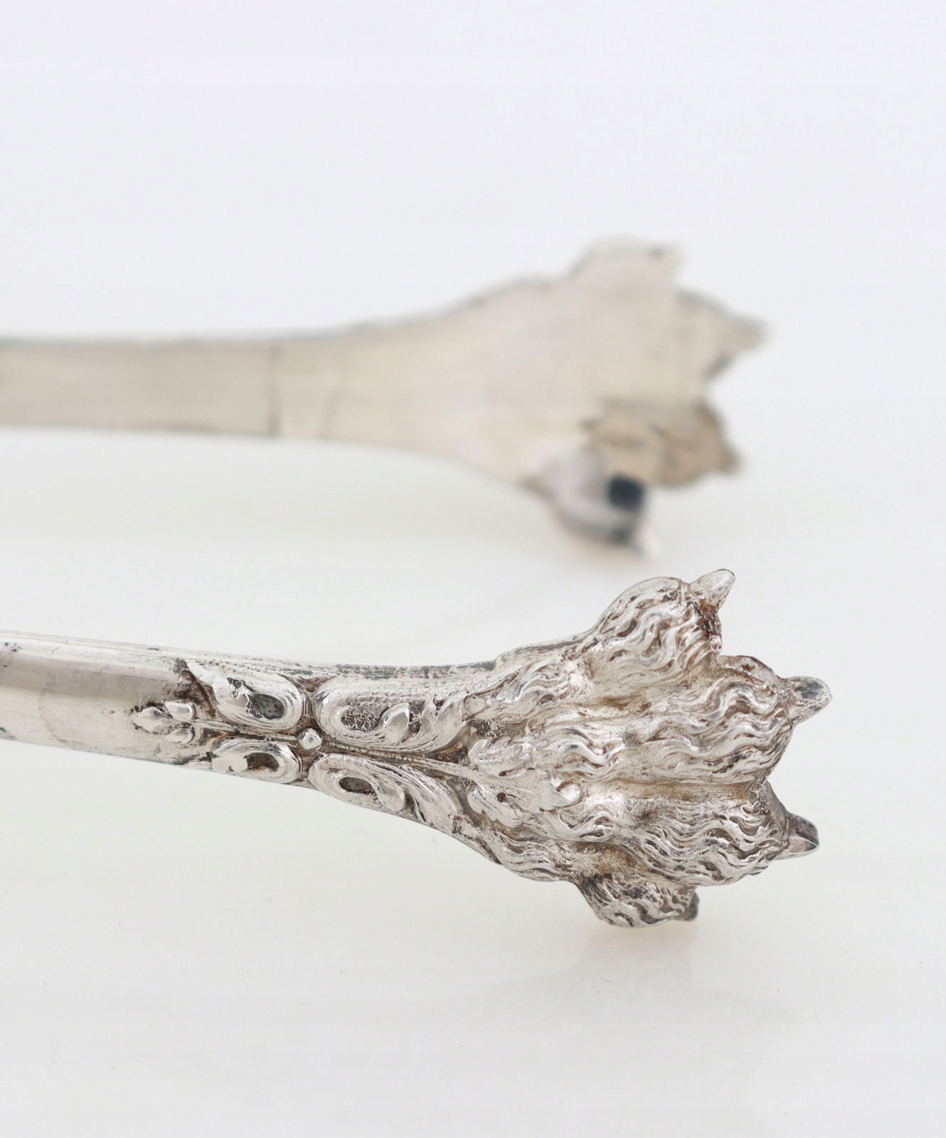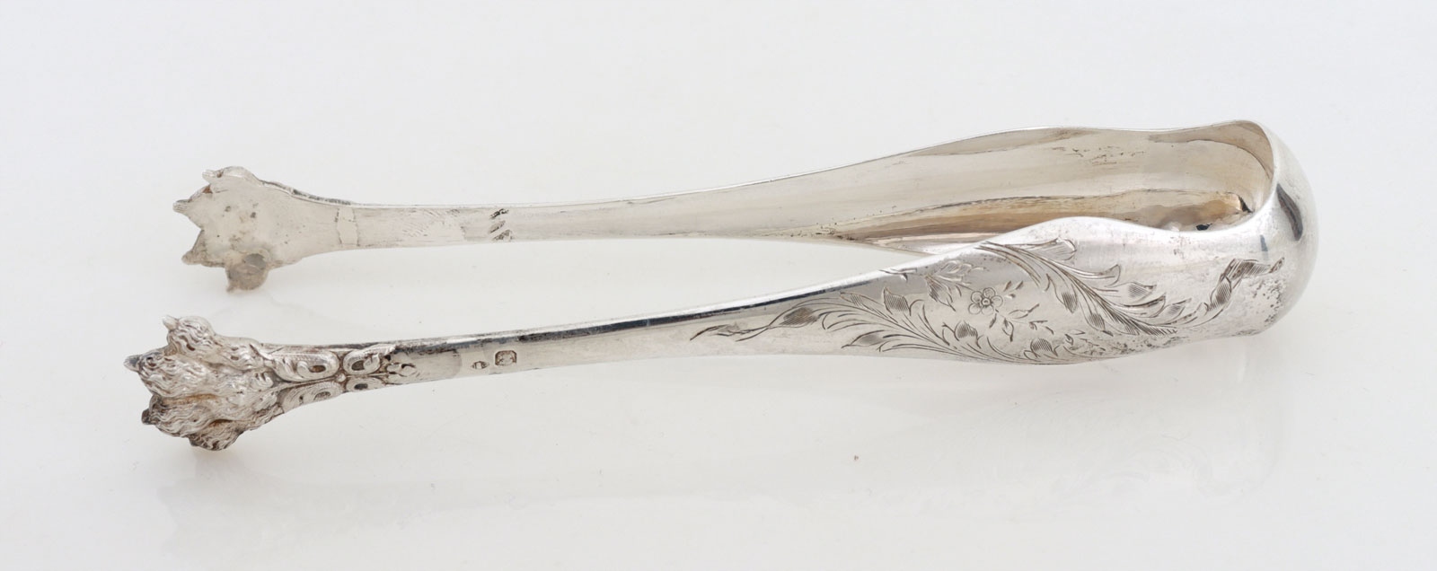 Щипцы для сахараиз серебра 950 пробы, украшенные гравировкой растительного мотива. Кончики в форме львиных лап.