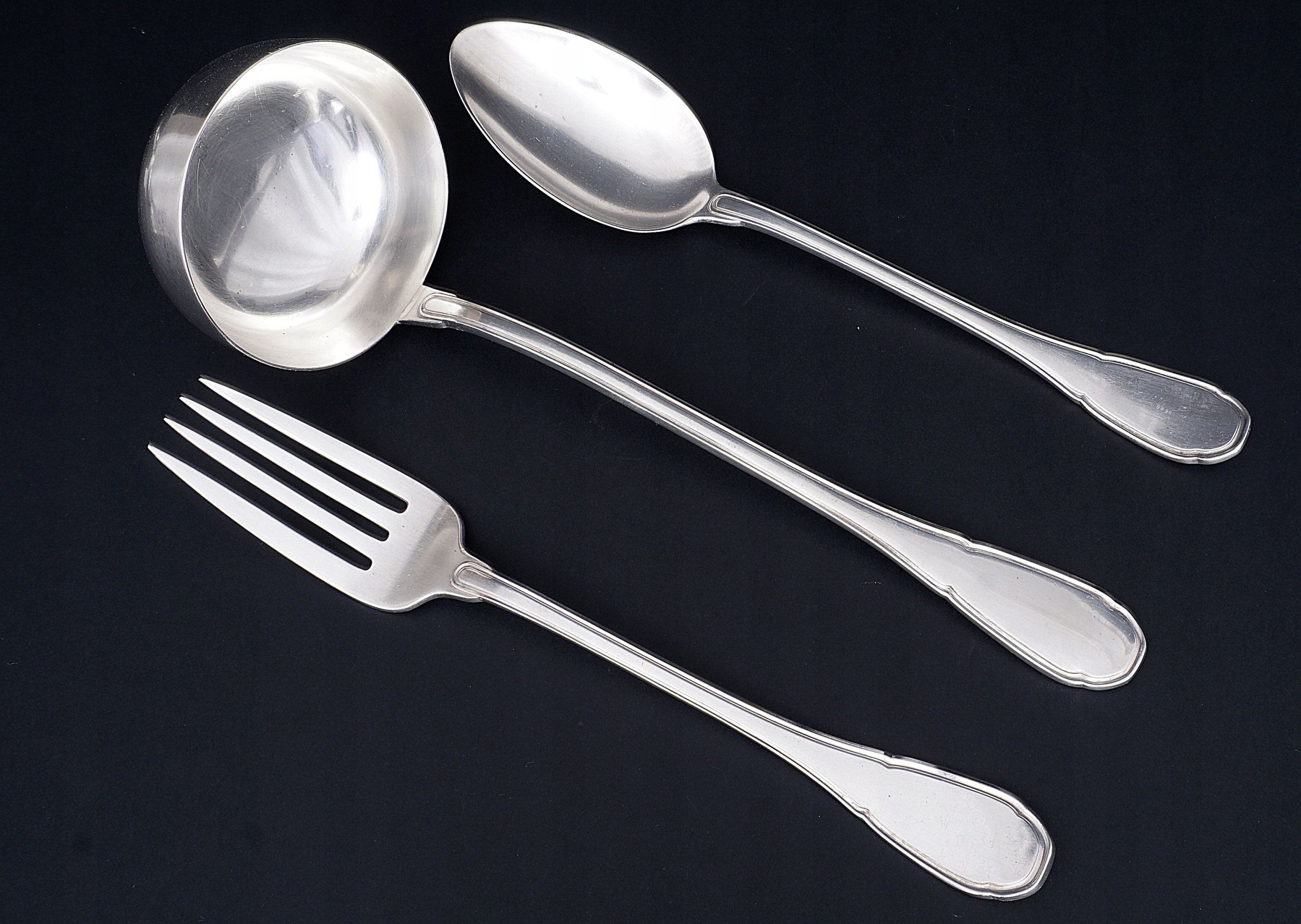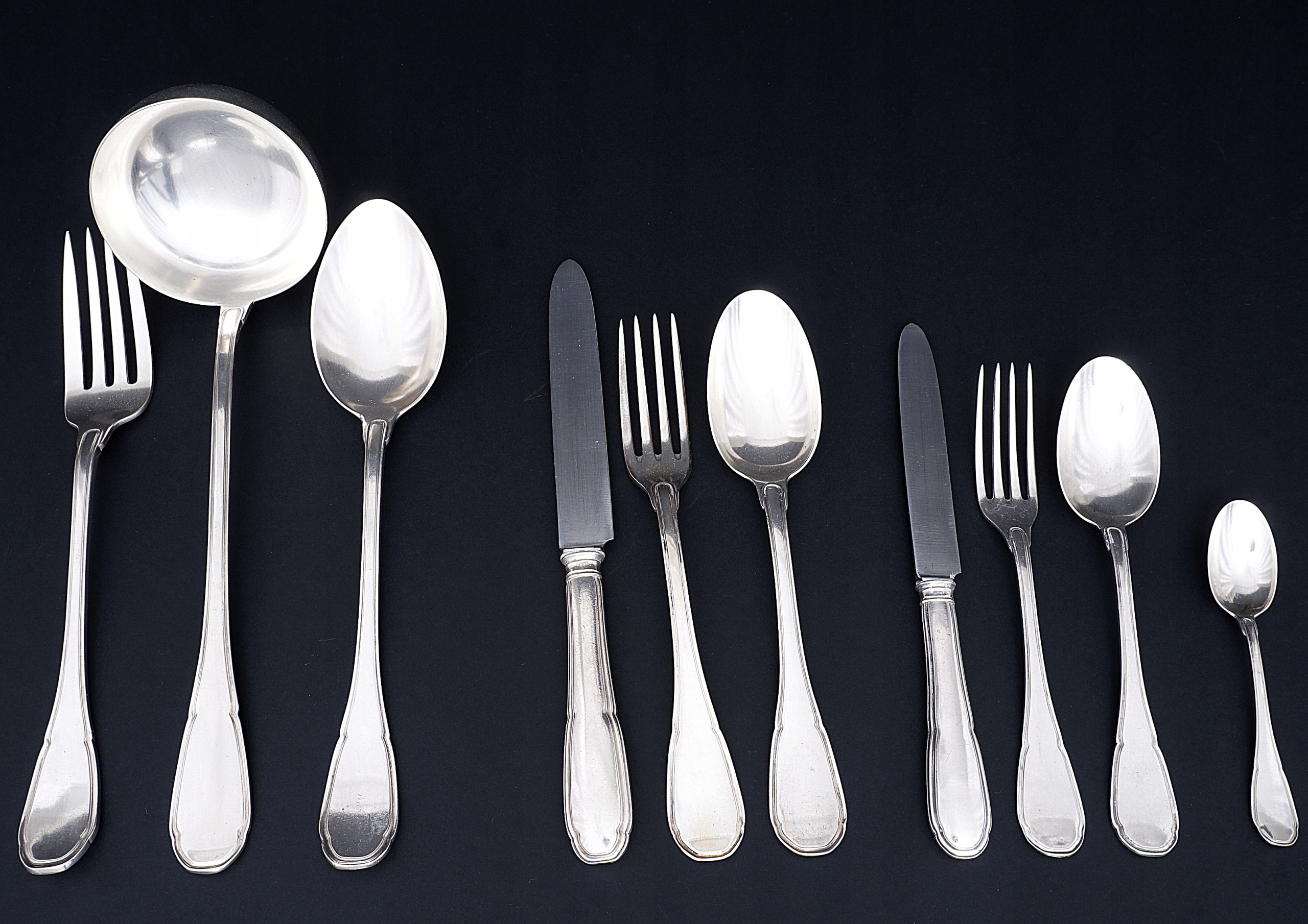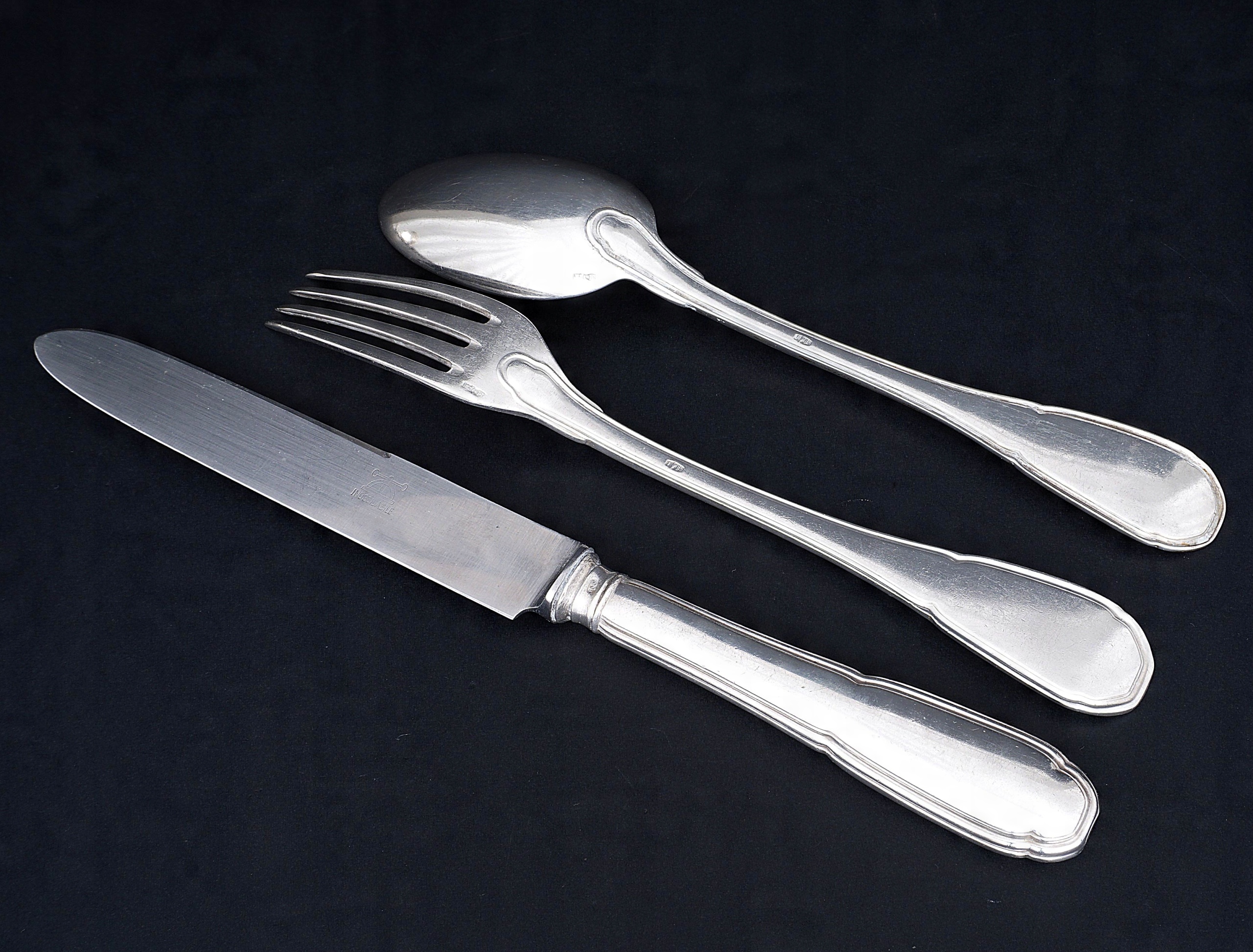 Набор столовых приборов на 12 персон из серебра 800 пробы.