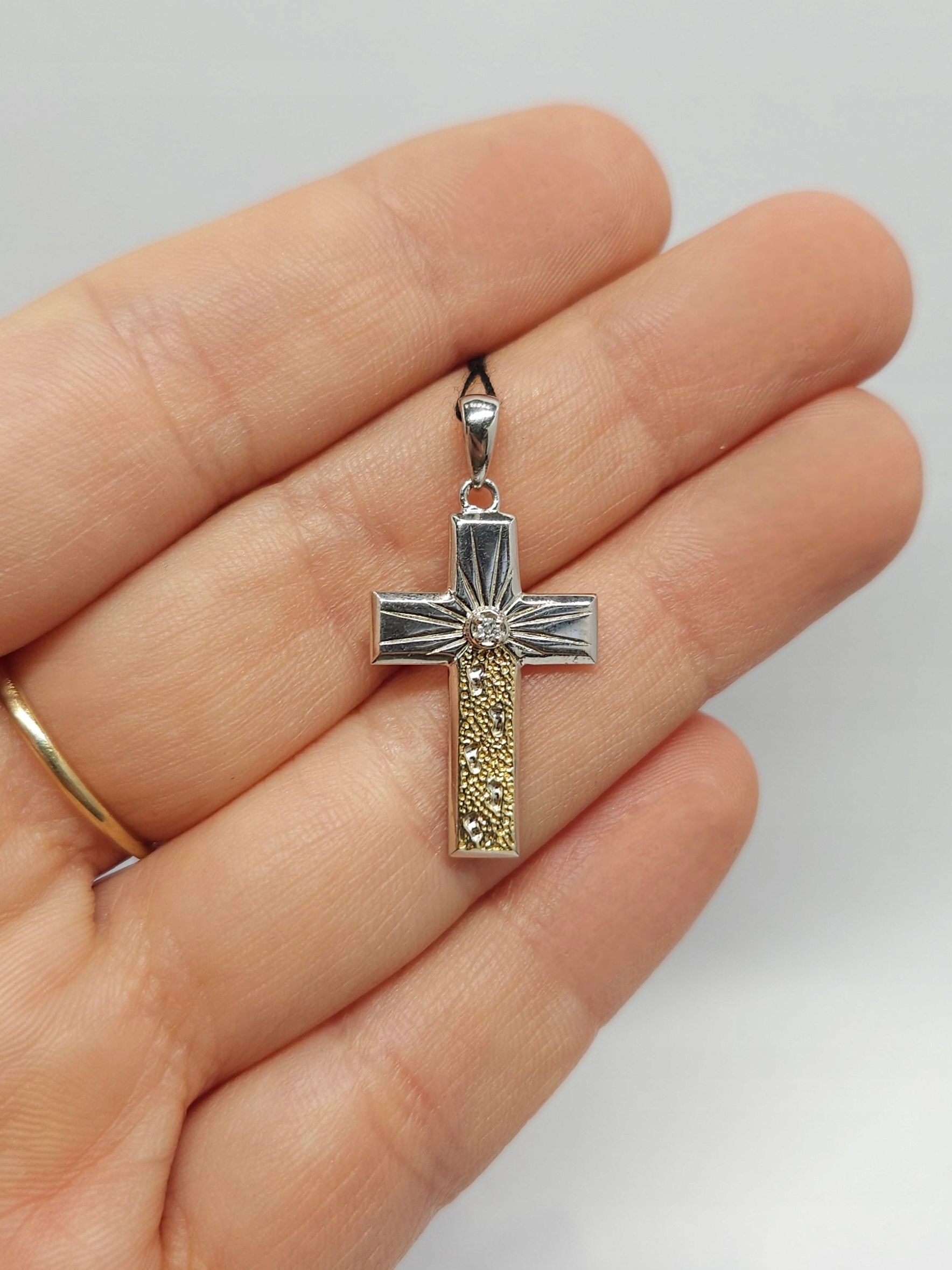 Серебряный, позолоченный крестик с бриллиантом ~0,012, серебро родиевое. 0,925