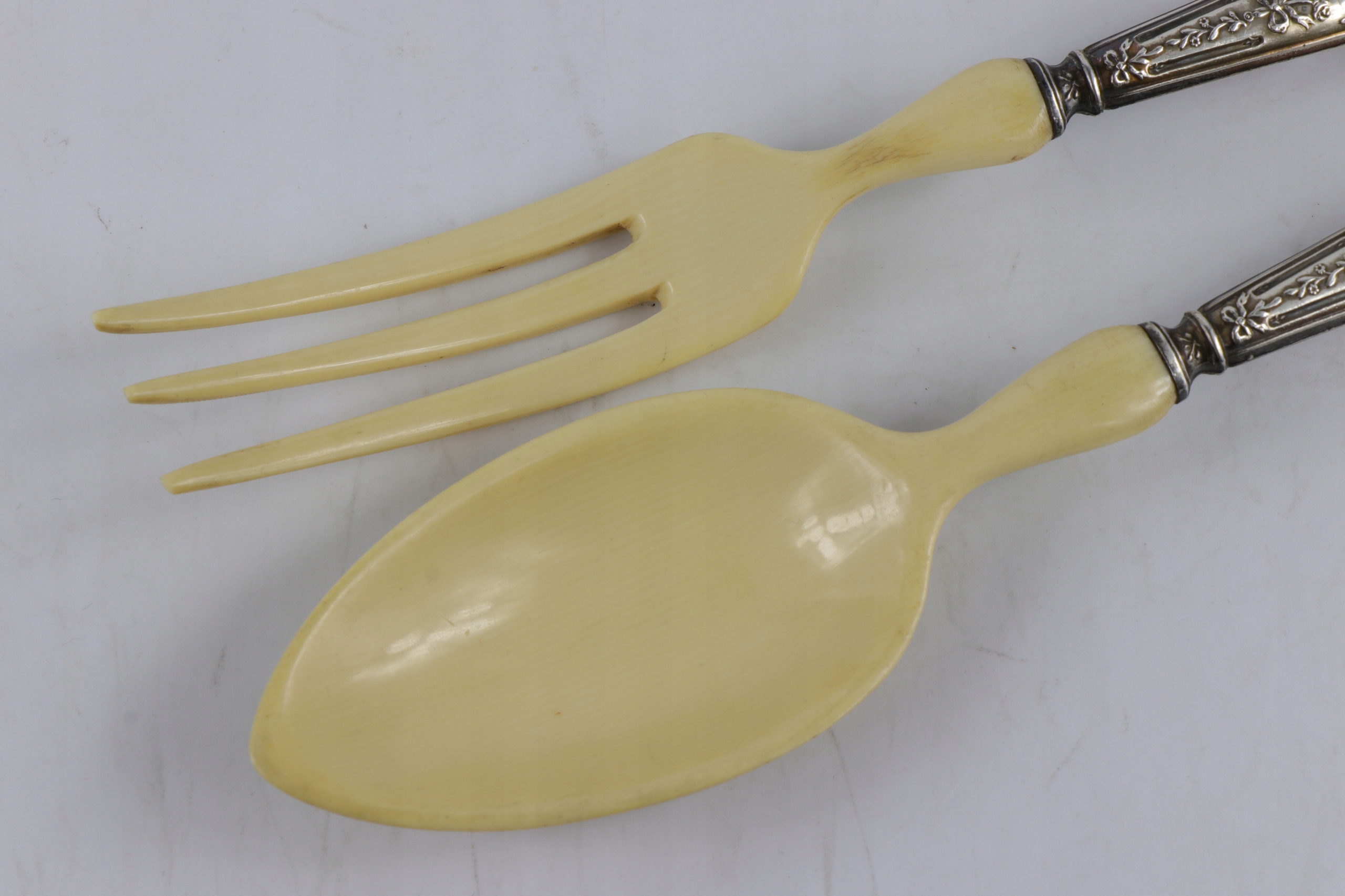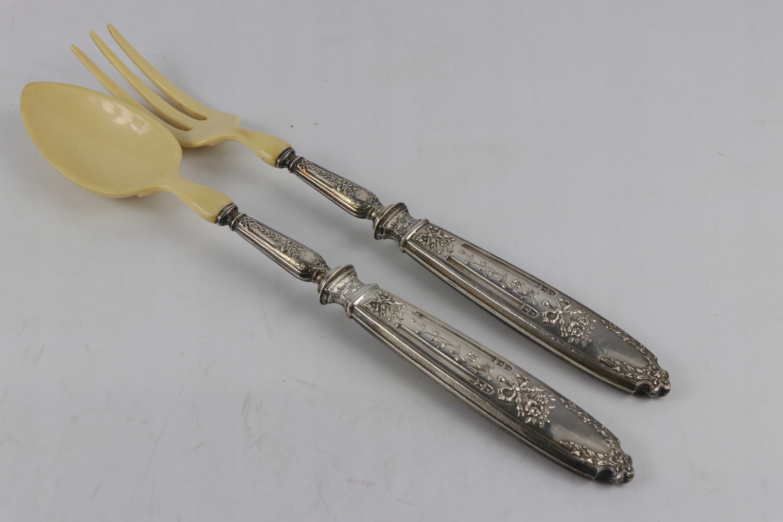 Набор столового сервиза для подачи салатов, состоящий из двух частей: вилки и ложки. Серебро со знаком Minerva и знаком производителя на обратной стороне. Ручки украшены красивым орнаментом в стиле рококо.