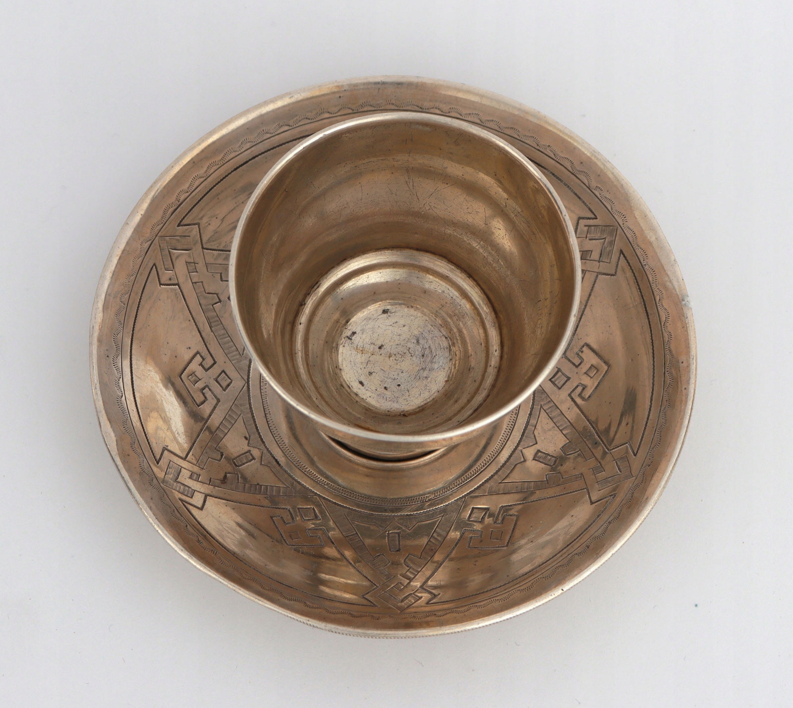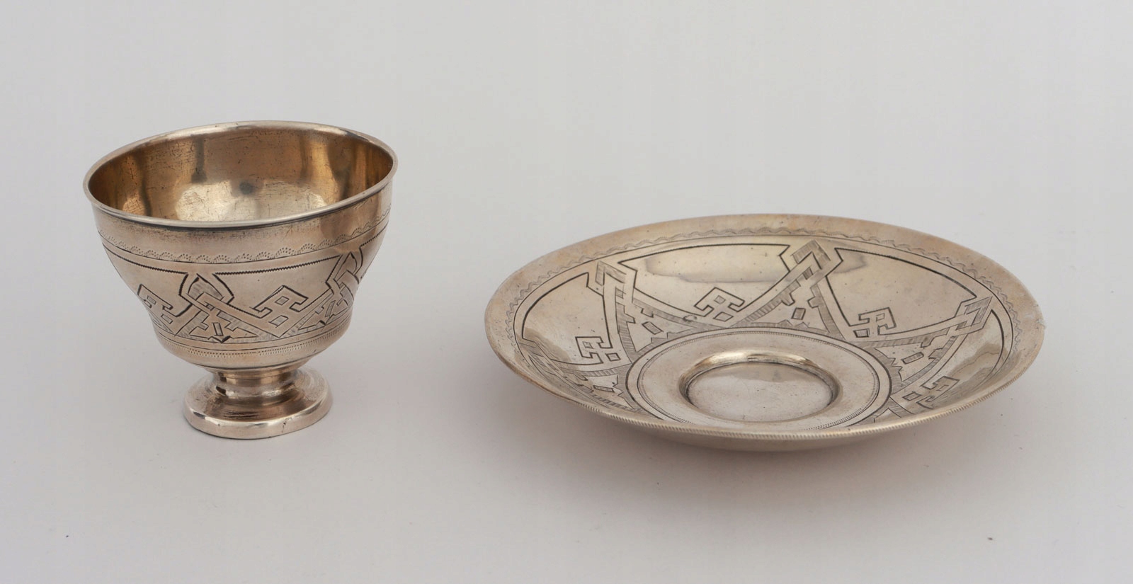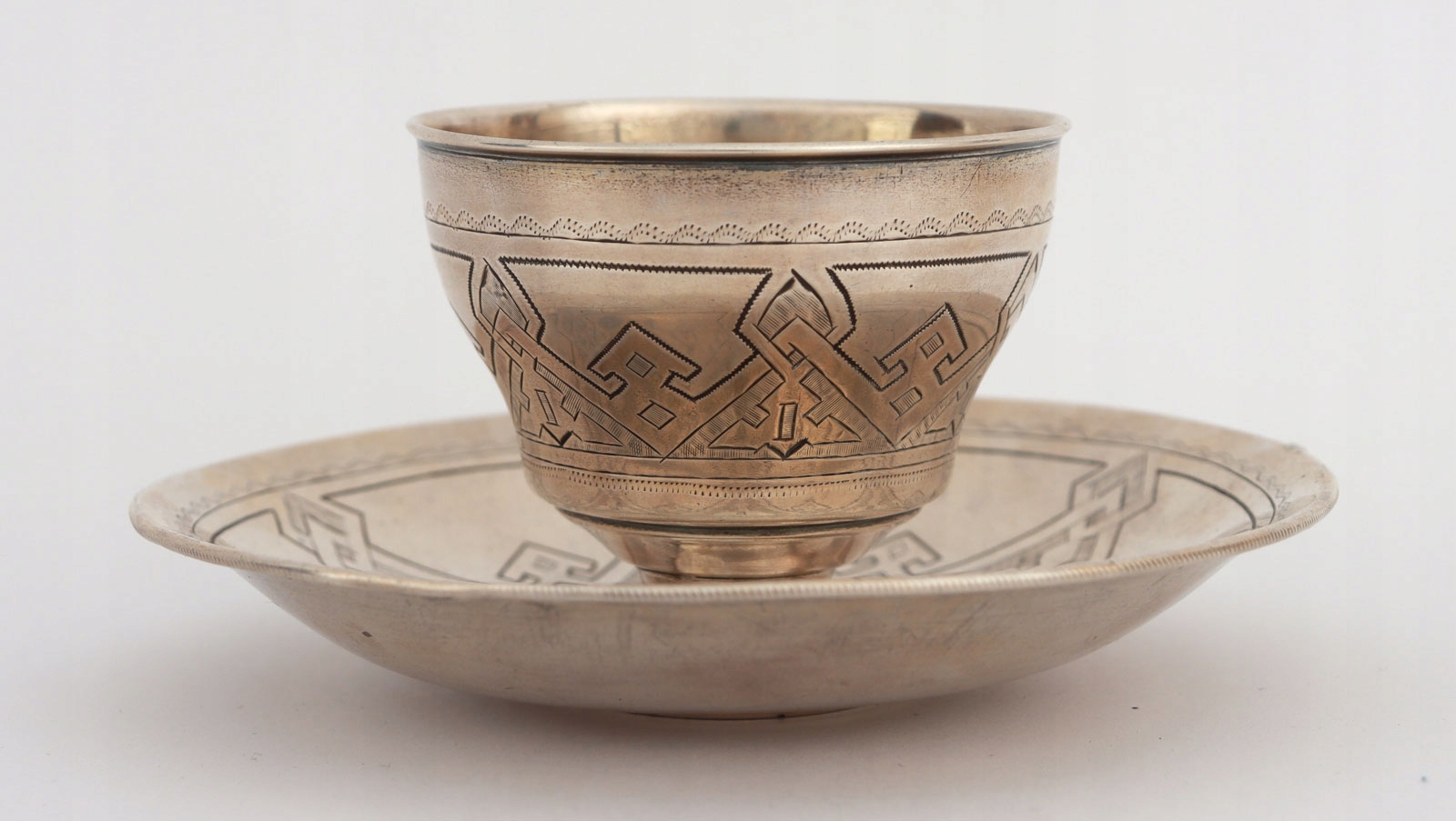 Черек с блюдцом из 84 серебра (0,875). Блюдца и чашка, украшенные вручную геометрический мотив вручную.
