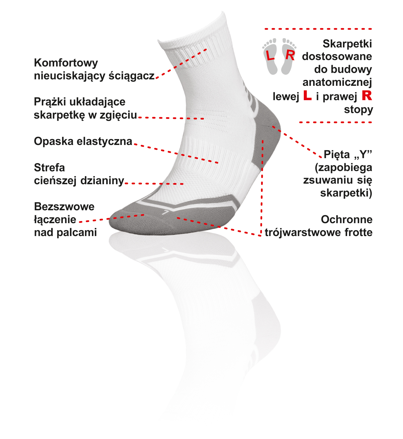 Трехслойная профилированная внутренняя махровая ткань поглощает удары и защищает чувствительные части стопы и лодыжки. Использование современной структуры волокон Prolen® SILTEX гарантирует, что влага отводится на слои от кожи, и ноги всегда остаются сухими. Ненесущая часть над стопой является воздухопроницаемой, что вместе с действием пряжи Prolen® SILTEX ускоряет отвод влаги. Носки из пряжи Prolen® SILTEX очень легкие и при этом в несколько раз прочнее хлопковых. Носки адаптированы к анатомической форме левой (L) и правой (R) стопы за счет соответствующей формы махровых частей. Lycra® по всей поверхности изделия обеспечивает превосходное прилегание к ноге. В средней части стопы имеется эластичная лента, которая предотвращает смещение носка по ноге. Правильно профилированная трикотажная ткань на пятке (образная буква «Y») идеально прилегает к стопе и стабилизирует ее. Поперечные полосы облегчают надевание носка на складку стопы. Бесшовное соединение обеспечивает максимальный комфорт, предотвращая потертости пальцев ног даже в экстремальных условиях. Благодаря содержанию СЕРЕБРА в пряже Prolen® SILTEX носки действуют как дезодорант. Уникальное антибактериальное и противогрибковое действие серебра предотвращает появление неприятных запахов во время использования и обеспечивает максимальную гигиену и комфорт использования носков.