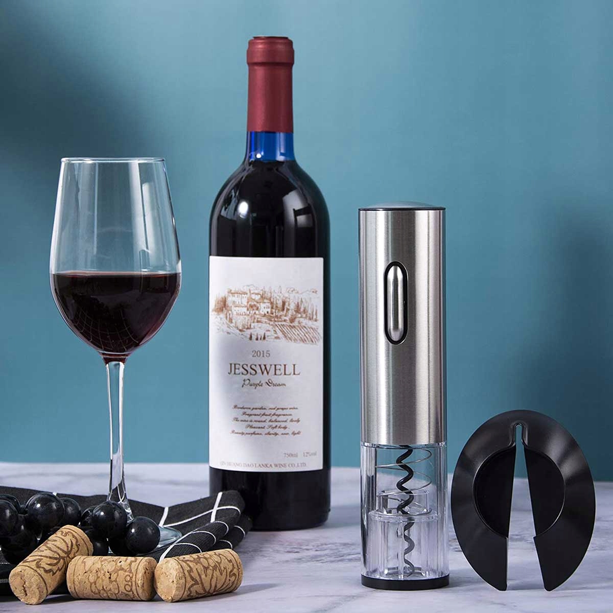 - Электрический штопор мгновенно удаляет пробки одним нажатием кнопки.