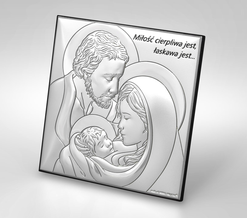 К серебряной картине со Святым Семейством мы бесплатно прикрепляем элегантную свадебную открытку для молодоженов с конвертом.