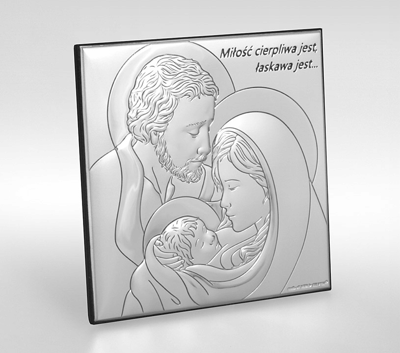 Серебряная картина с изображением Святого Семейства с Младенцем на белом панно. Прекрасный подарок жениху и невесте по случаю Свадьбы, к годовщине свадьбы, в качестве сувенира родителям жениха и невесты или по другим поводам.