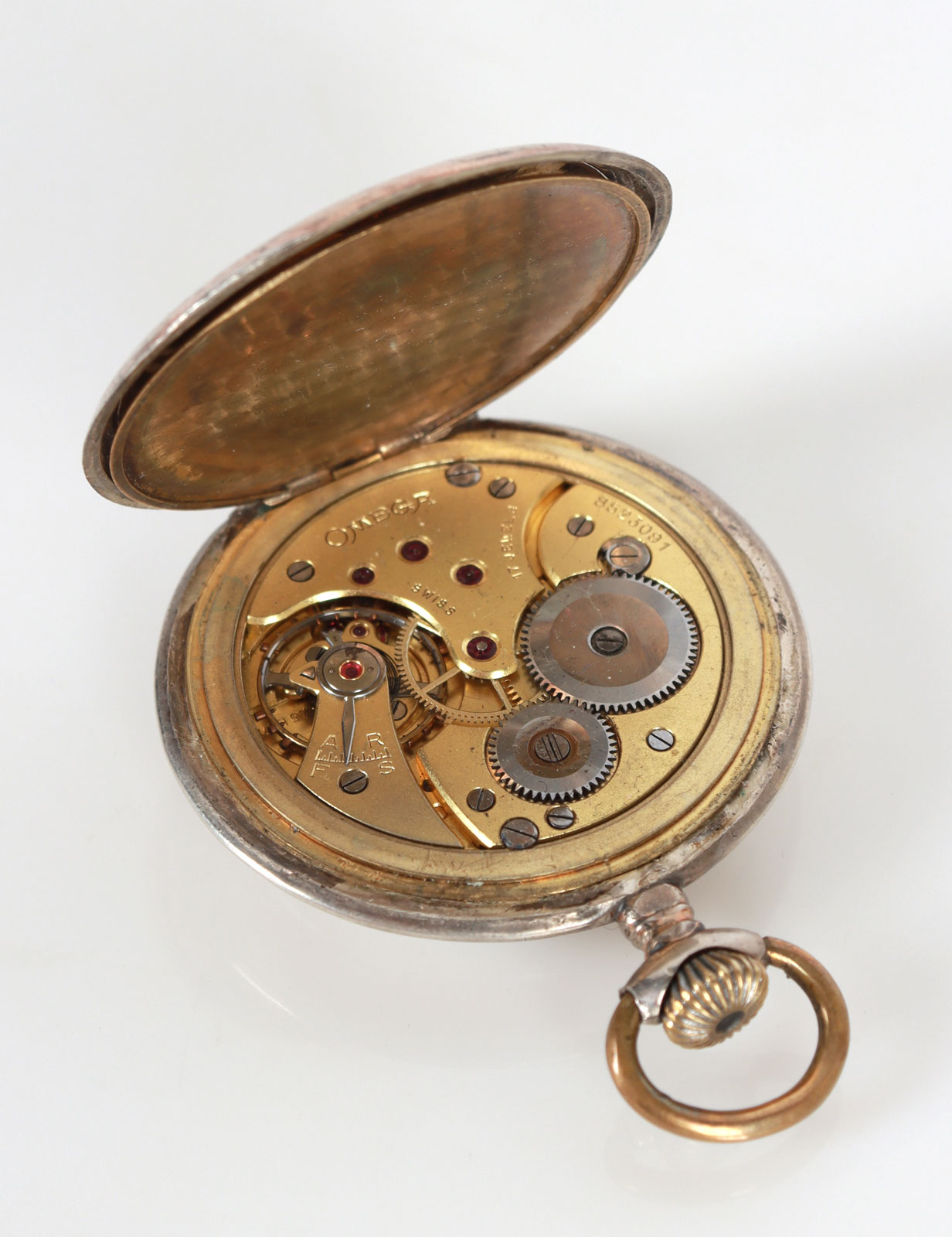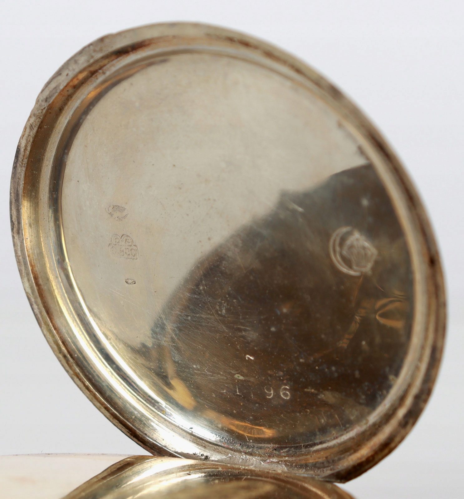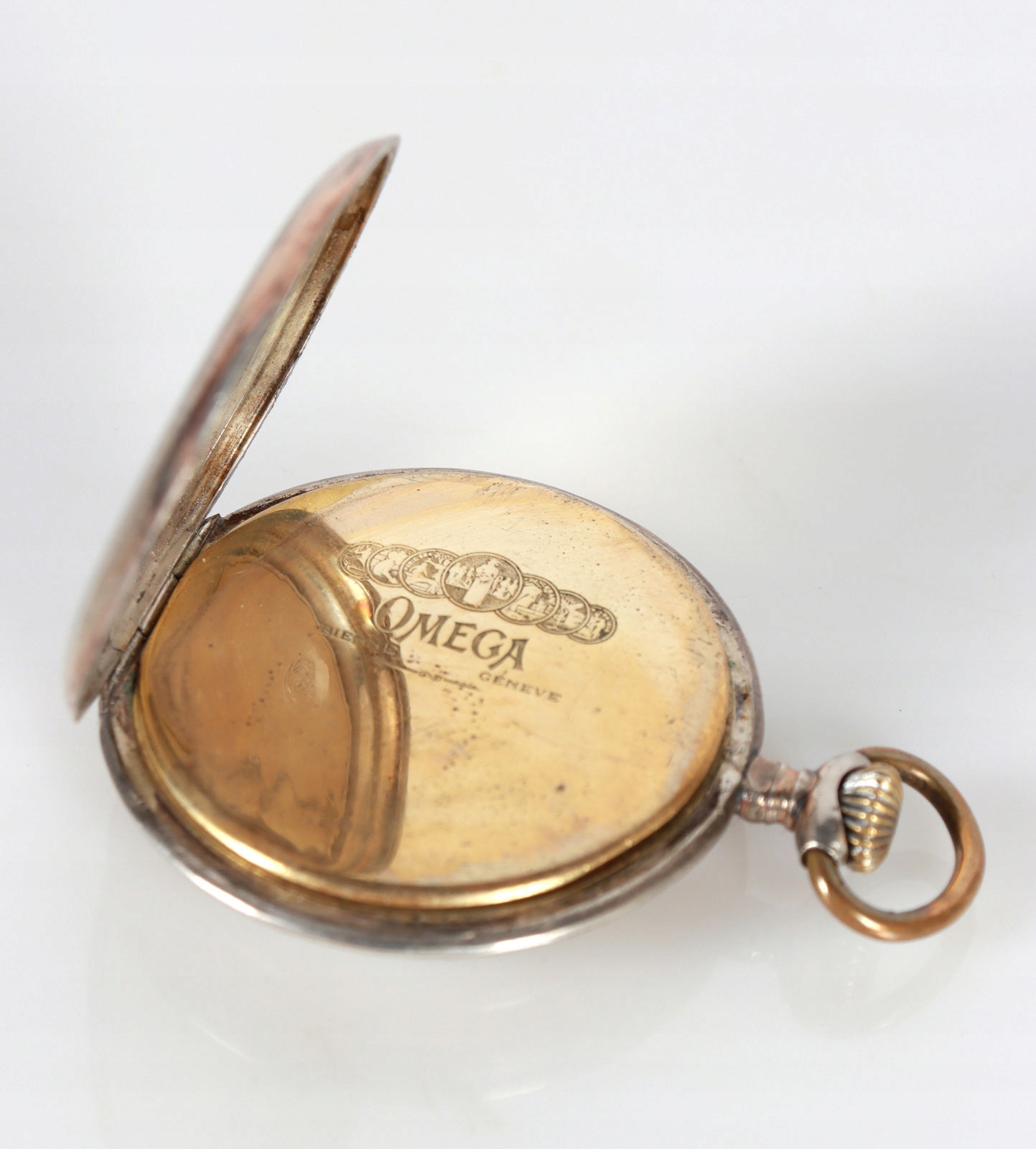 два камня карманных часа, внешняя конверт из 800 серебра. Гильо -конверт с декоративным картушем. Внутренняя конверт из металла. Механизм с якорной крышкой на 17 сатонах.