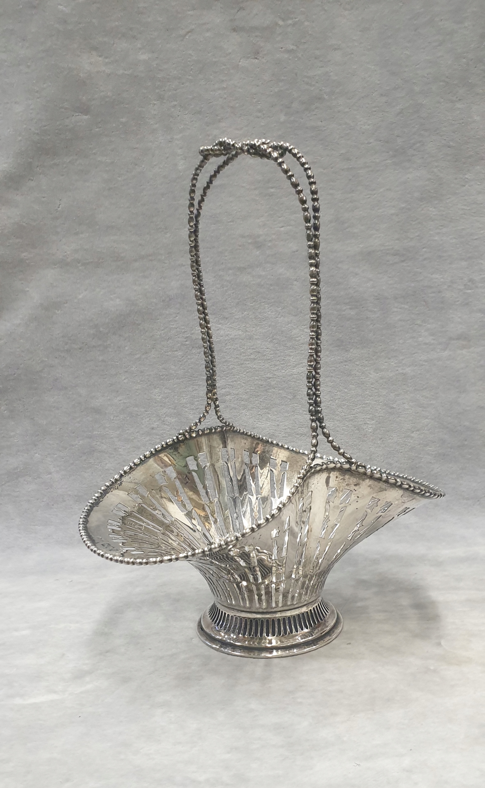 Тарелка - Серебряная корзинка Ажурное серебро 925 пробы, вес 215 г, высота 9 см (с ручкой 22 см), ширина 17х13см. Штамповка: клеймо ювелира в картуше PHK, шагающий лев, голова льва, датирующая буква «q» (1931 г.), таможенный знак Англии, Лондона, Филиппа Мэнсона, Эббота, 1931 г.