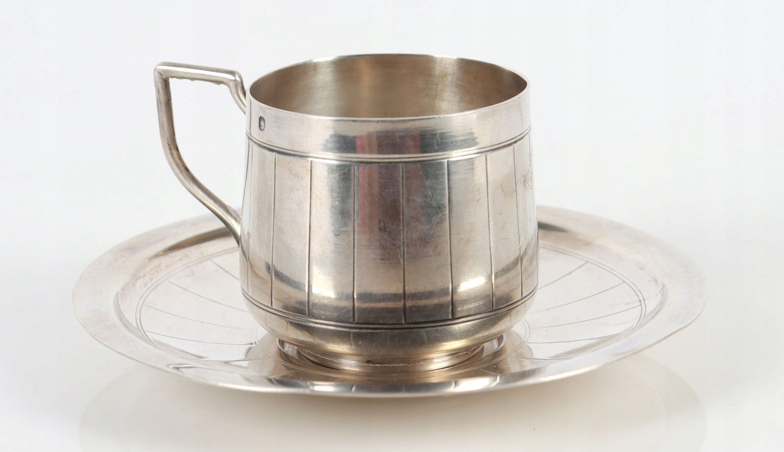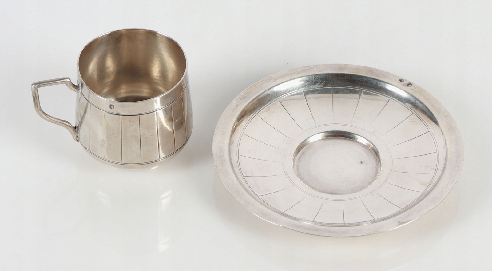 чашка с блюдцом из 950 серебра. чашка с блюдкой, украшенной идентичным геометрическим узором. На выгравированном письме.