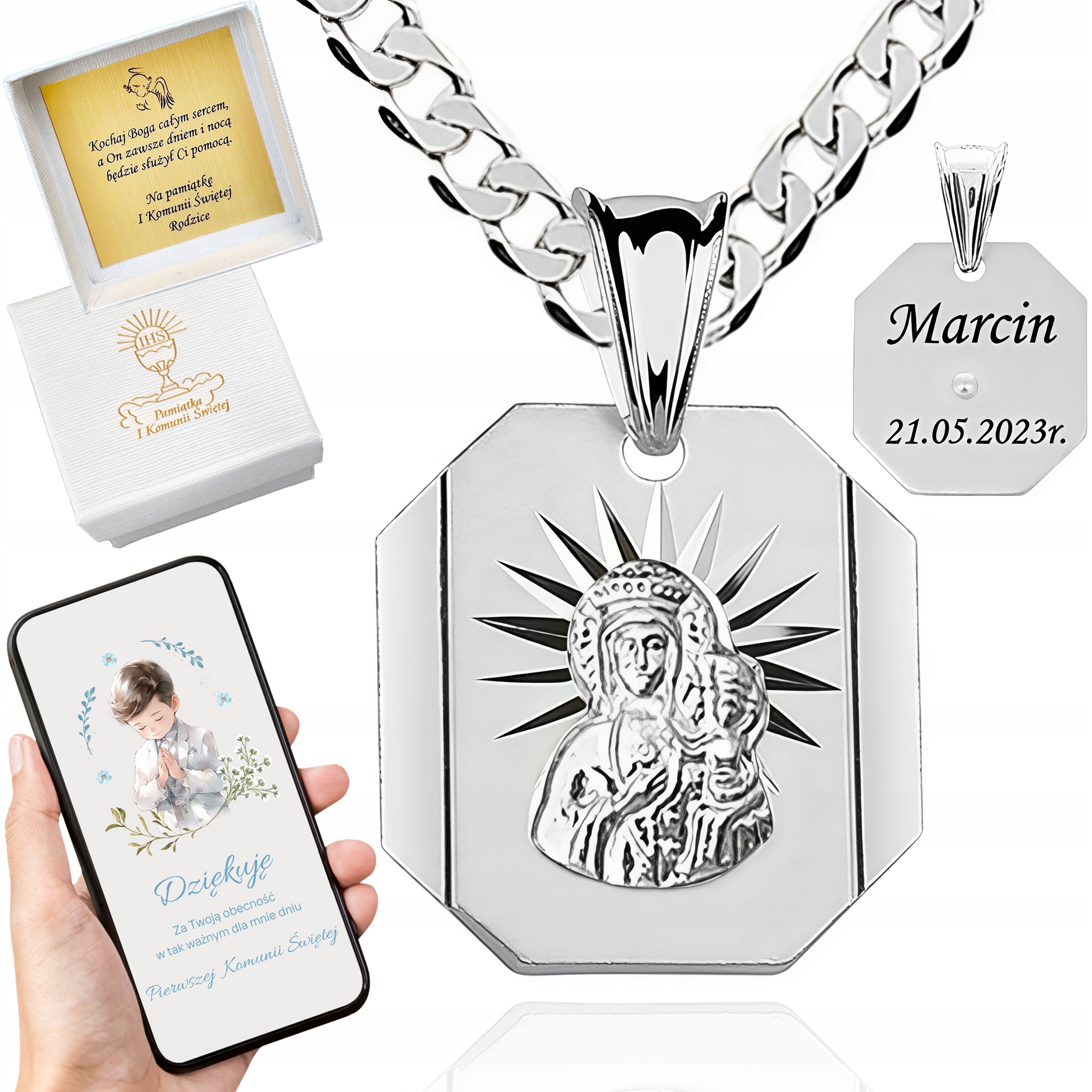 После покупки дополнительной услуги будет прикреплен набор упаковки премиум -класса. Вы можете выбрать коробку по случаю святого причастия, святого крещения и универсального. Посвящение напечатано на золотой блестящей бумаге, которая интегрирована с крышкой коробки. Чтобы предотвратить случайное открытие, мы использовали закрытие магнита - простое и эффективное решение.