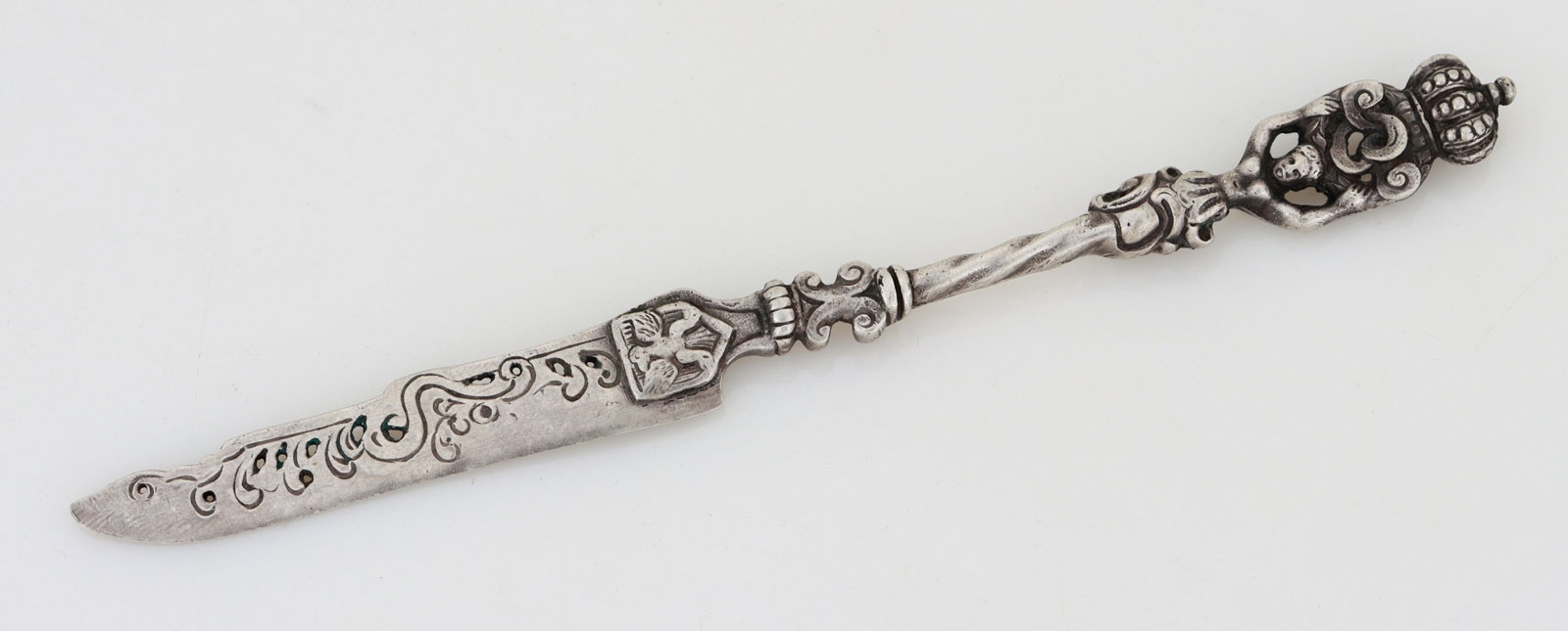 Нож для бумагииз серебра 800 пробы. Ажурное лезвие, рукоятка увенчана пластиковой кариатидой с короной.
