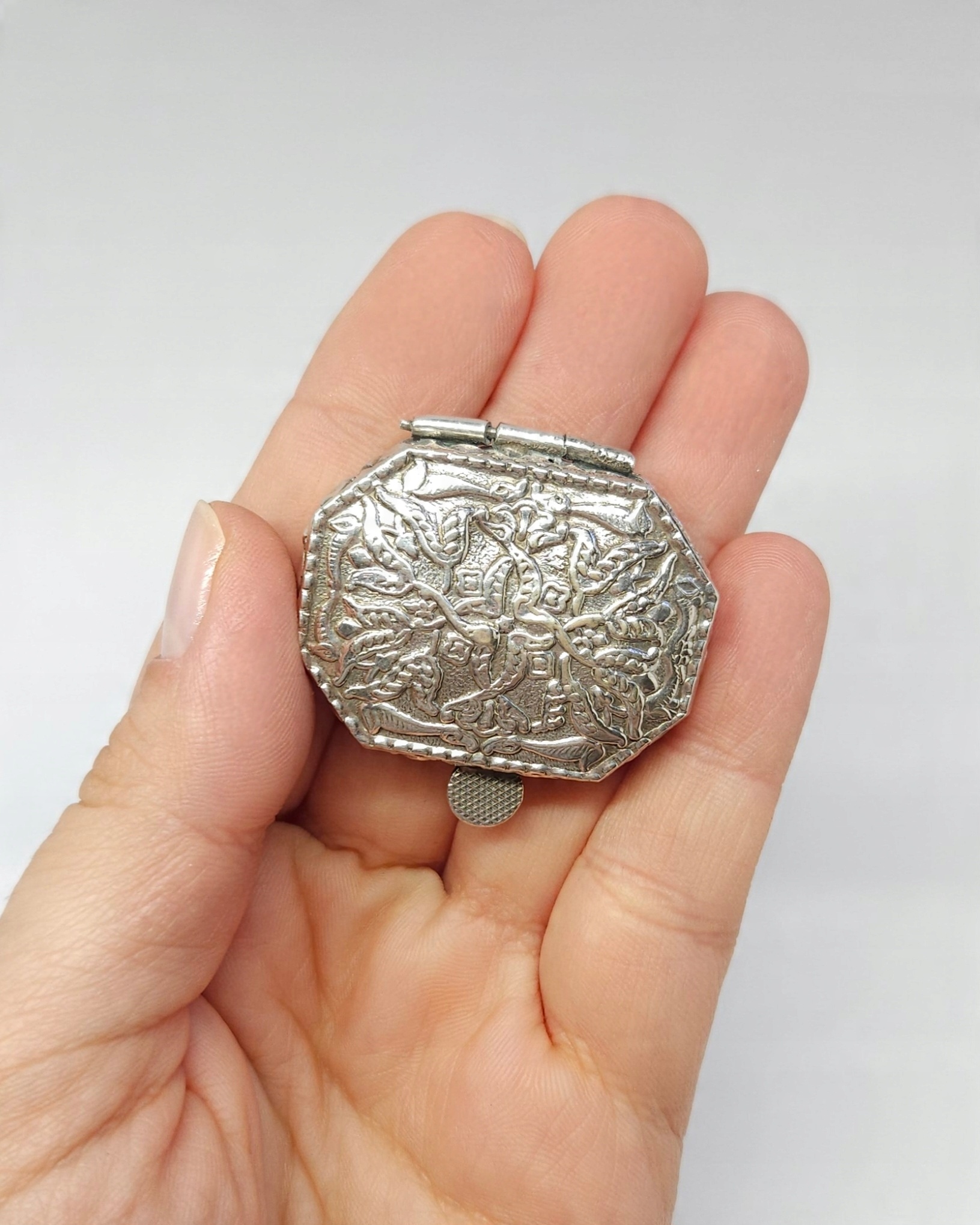 серебро, полигональная коробка ... Портор, с богато оформленной, нажатой поверхностью; Из -за возраста шарнир немного свободно, но коробка плотно закрывается и сильно закрывается