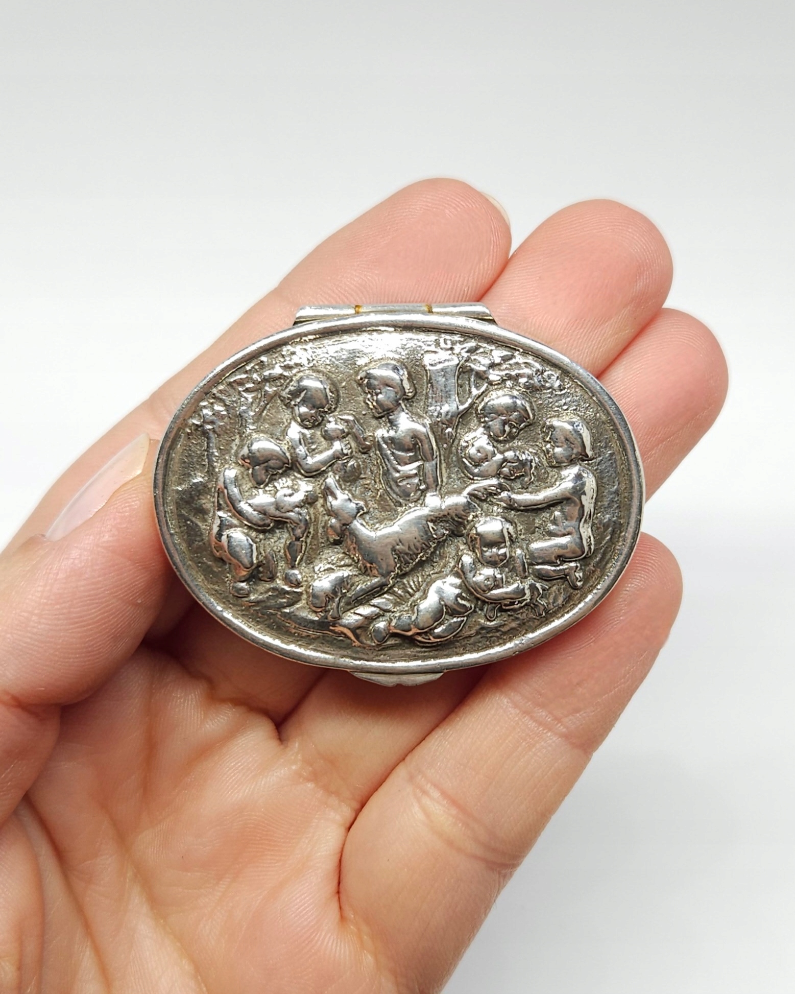 серебро, овальная коробка ... Pigularz, с крышкой, украшенной сценой из тисненого жанра с путтом и собаками; позолоченный интерьер; Из -за возраста видимым небольшим вмятины