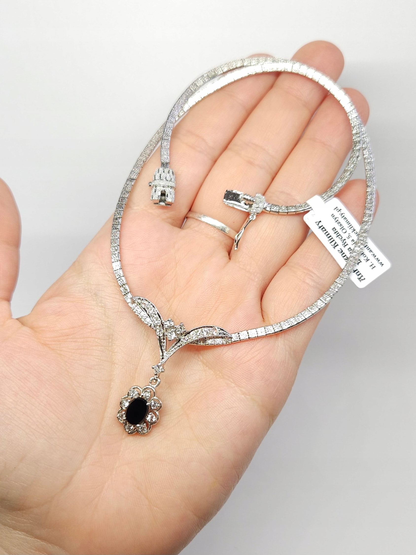 Ожерелье из родиумного серебра, с декоративным элементом, взорванным цирконом и черным камнем из цветного стекла; Ожерелье имеет застежку ящика с дополнительной защитой