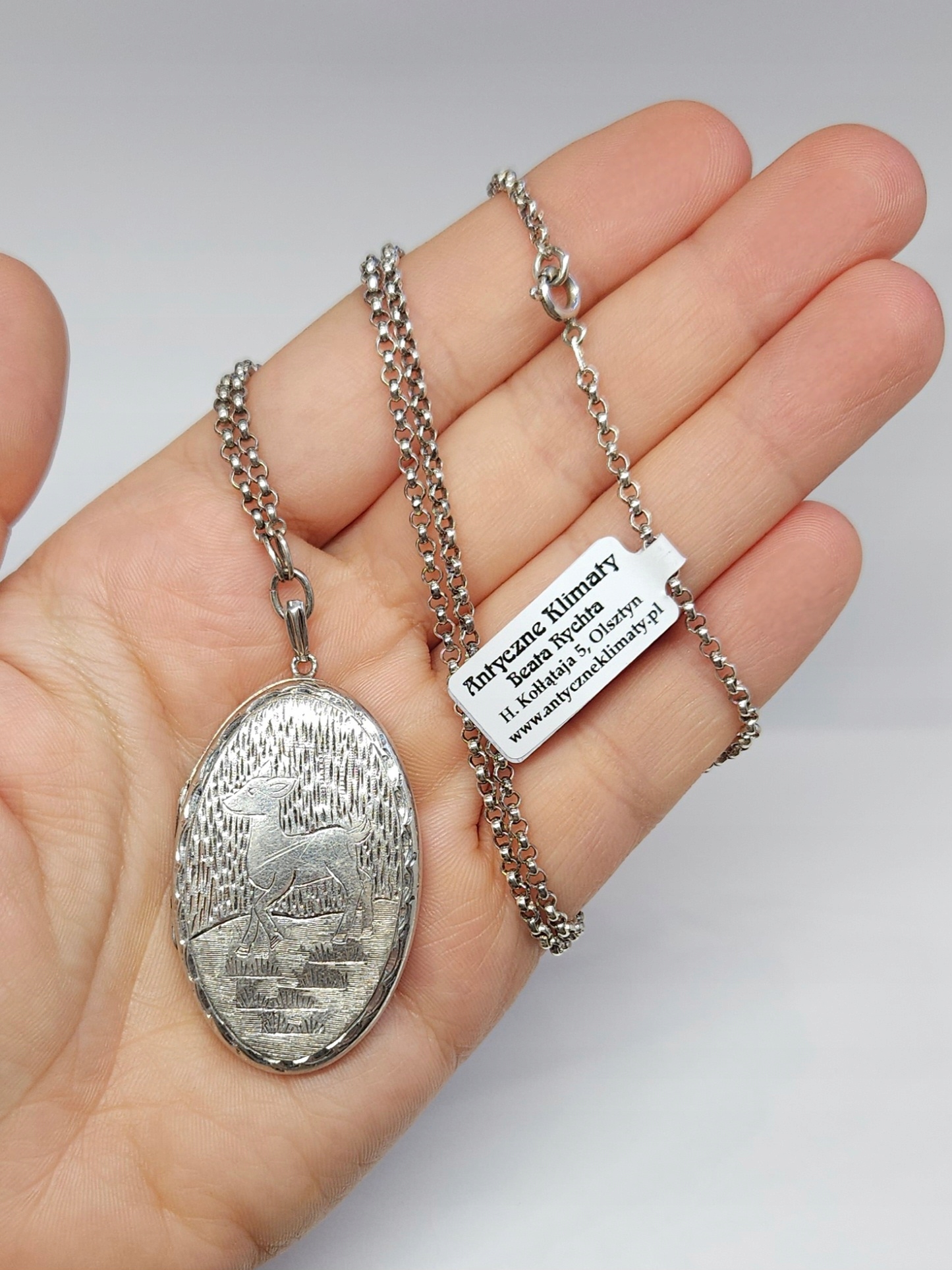 Серебряный кулон - овальный секретарь с пространством для двух фотографий, украшенный мотивом с оленем с оленем с оленем, в комплекте с цепью Rolo - цепь и подвеска; Из -за возраста световые признаки использования видимых
