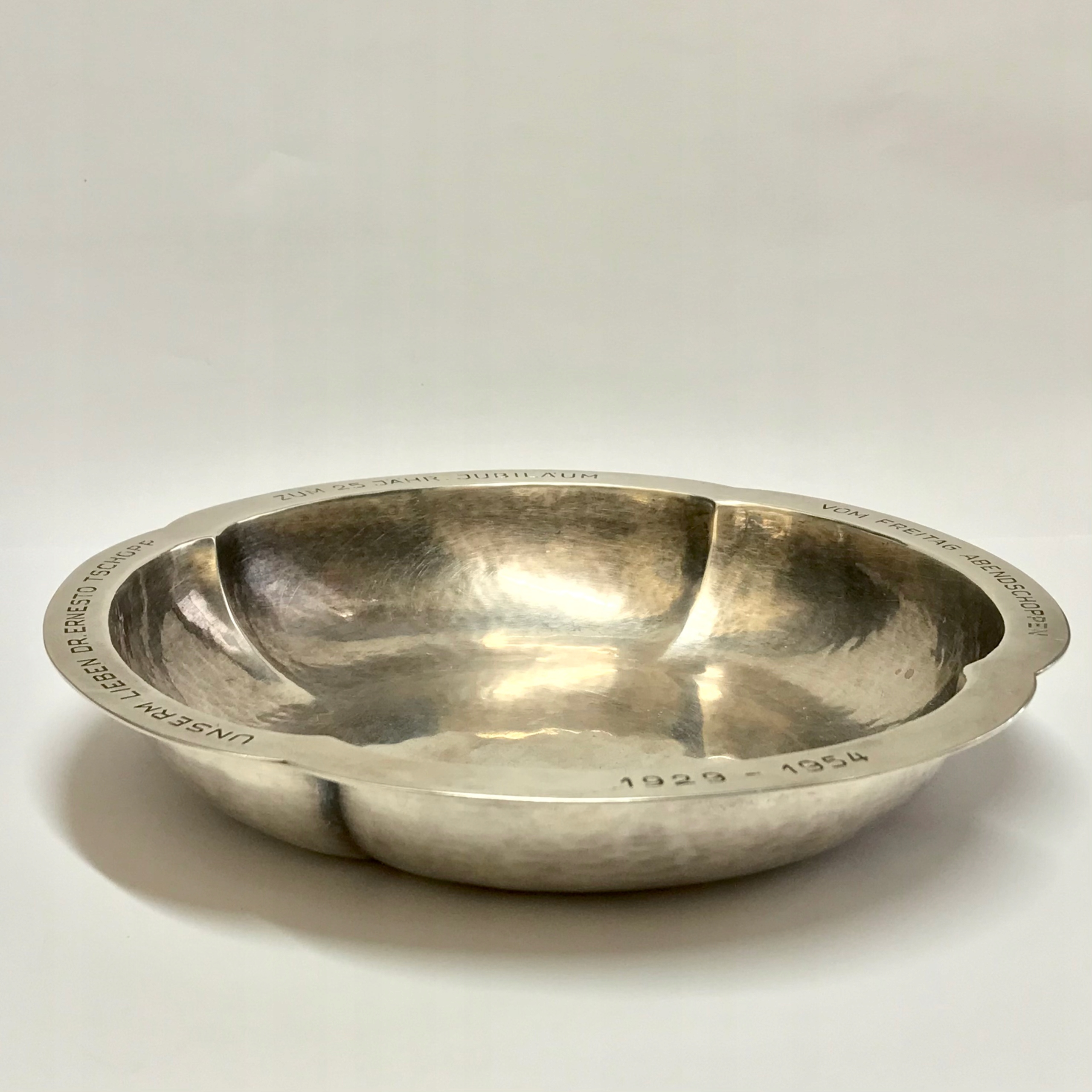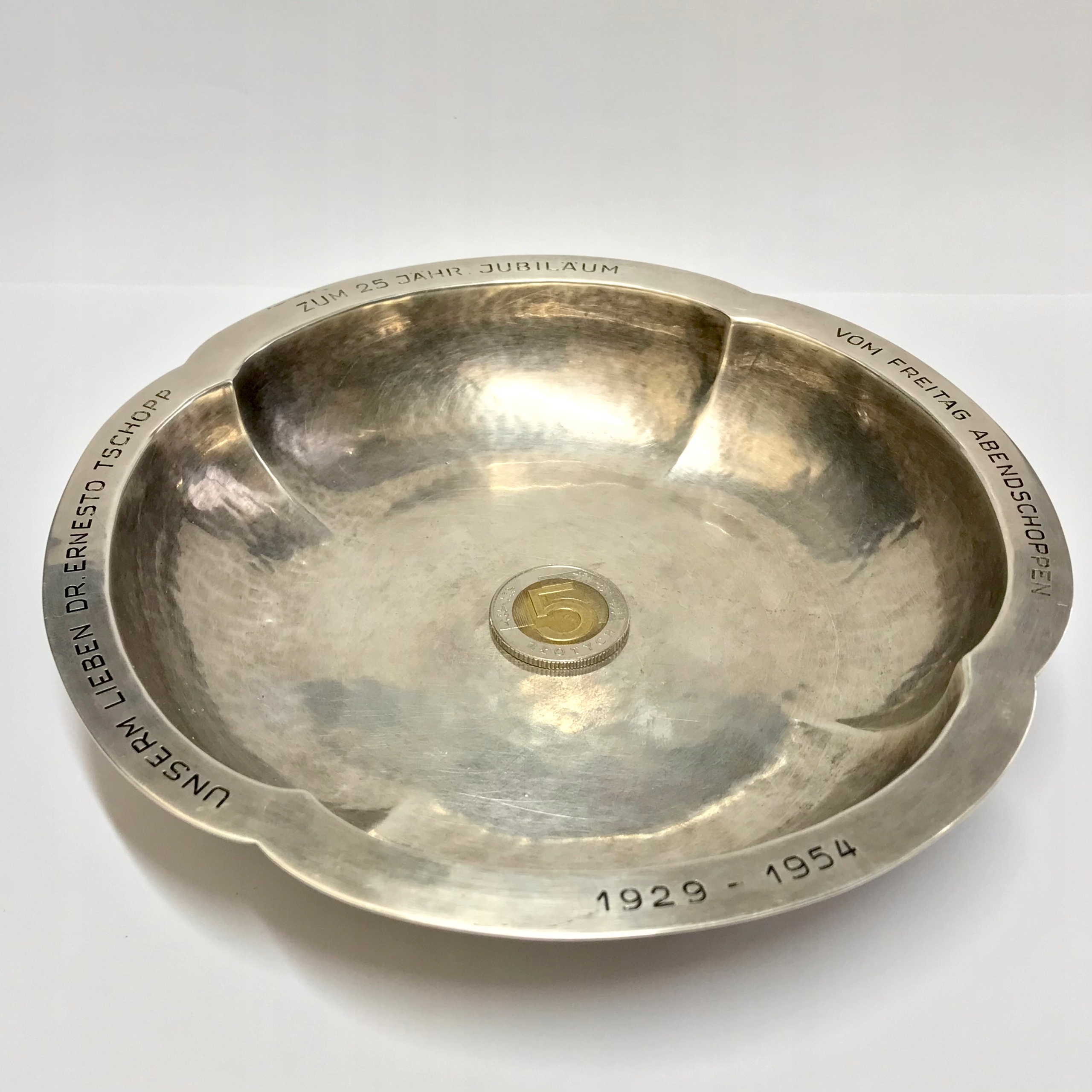 - Серебряная подставка для швейцарского торта от ISLER. По краю выгравирована надпись на английском языке. Немецкий - подарен друзьями доктору Эрнесто Чоппу по случаю его 25-летия.