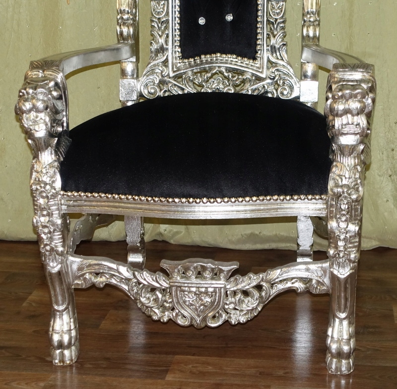 Стильное кресло - трон. Деревянное сооружение, как и подобает стилю барокко, богато украшено резьбой из серебра. Черная обивка из плюша, эстетично отделанная латунной булавкой, стеганая спинка и украшенная блестками Swarovski. Предмет мебели, сделанный современным, сохраняя при этом старые формы.