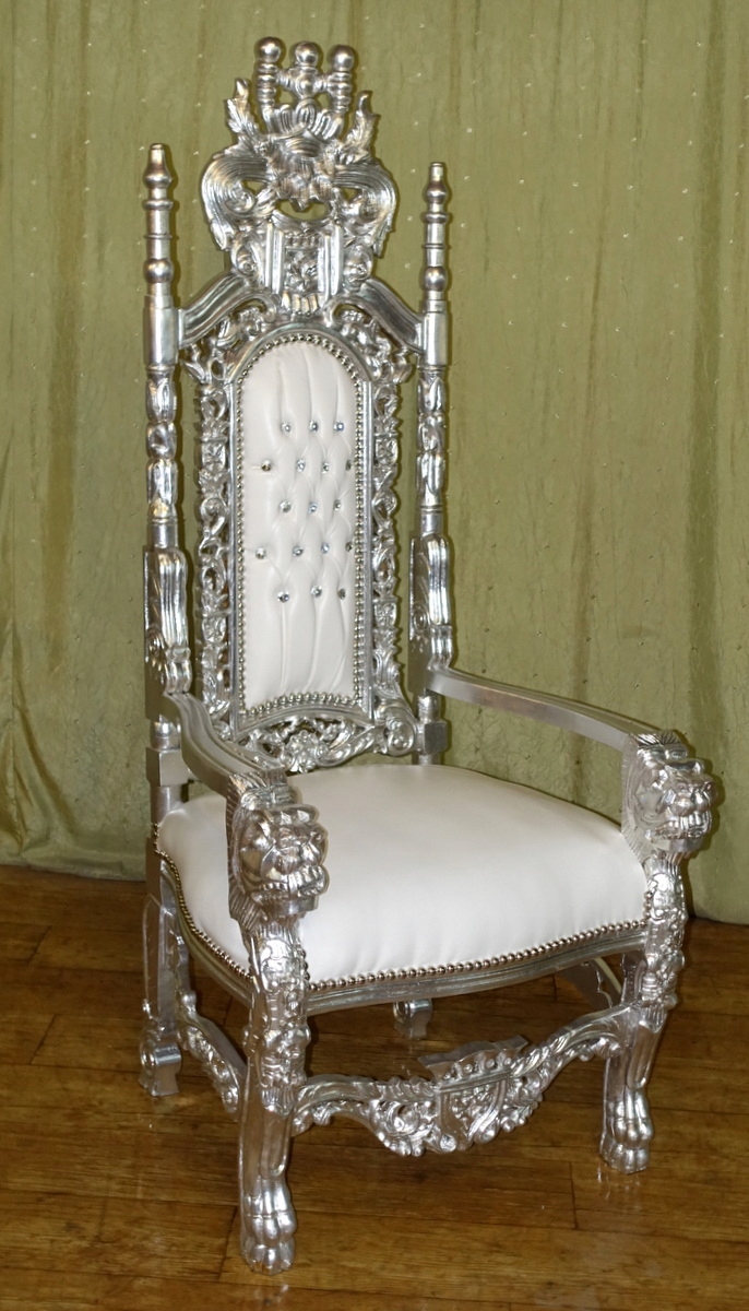 кресло - трон h1> Стильное кресло - трон. Деревянная конструкция, как и в стиле барокко, богато вырезанной в серебре. Белая обивка из экологической кожи, эстетически отделанная с никелевой сосной, и стегала на спине и украшена блестками - очень хорошее состояние. h1> климат. h1>