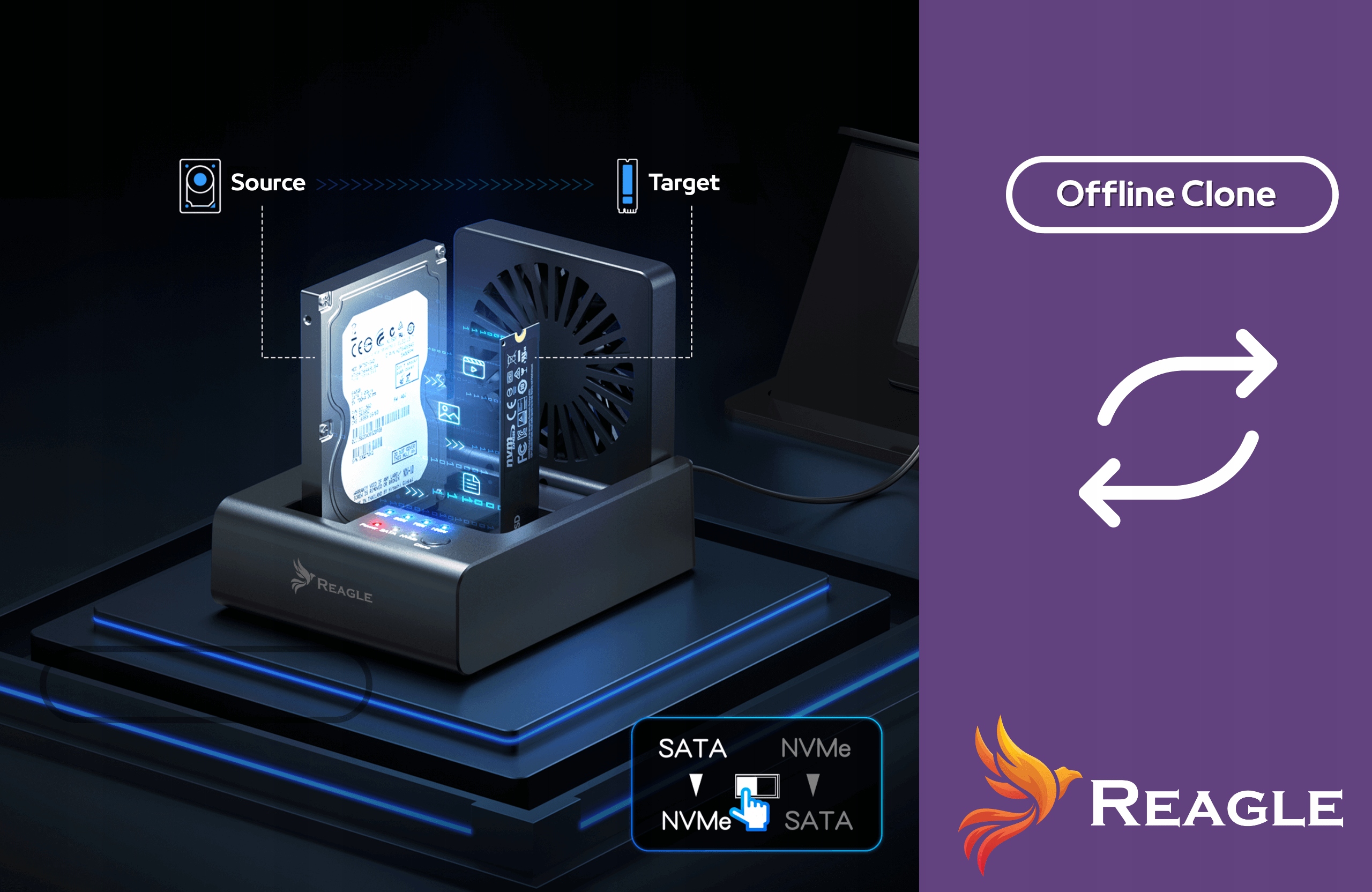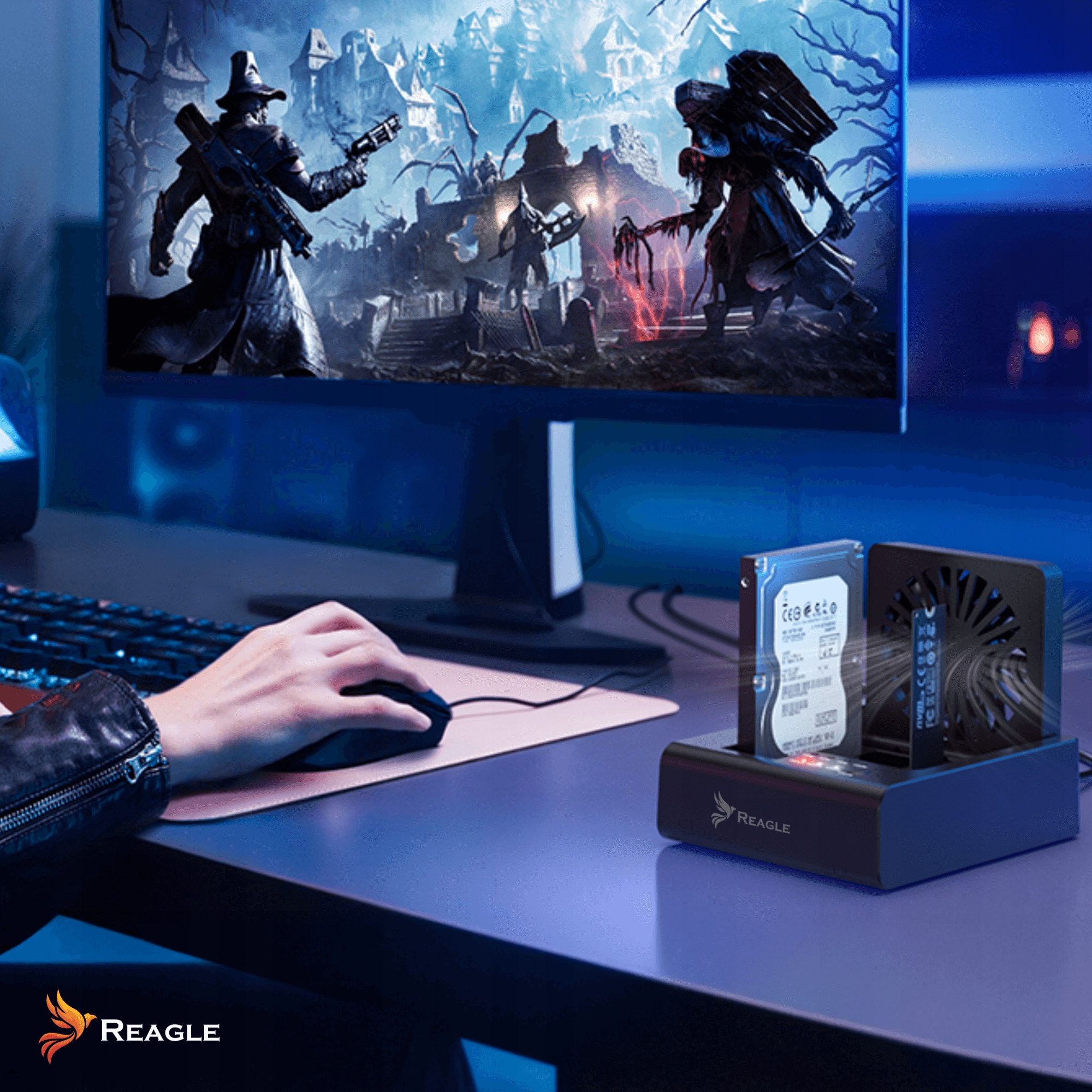 Станция клонирования RDOC63 позволяет клонировать диски без использования компьютера. Просто вставьте исходный и целевой диски, запустите процесс и подождите, пока устройство автоматически скопирует все данные. Функция также поддерживает загрузочный SSD, что позволяет быстро перенести систему и программы на новый носитель — готовый к немедленному запуску.