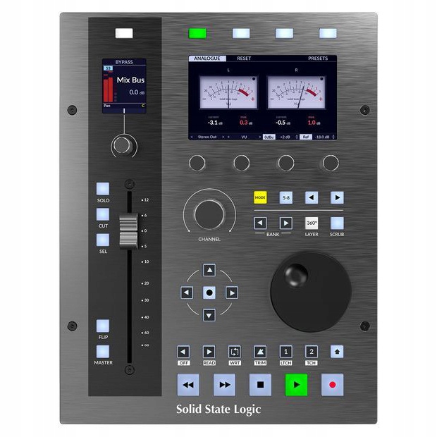 - 2 цветные ручки TFT высокого разрешения ЖК-дисплеи (4,3 дюйма / 1,77 дюйма) для отображения названий дорожек, параметров, сведений о плагине SSL Meter и т. д.