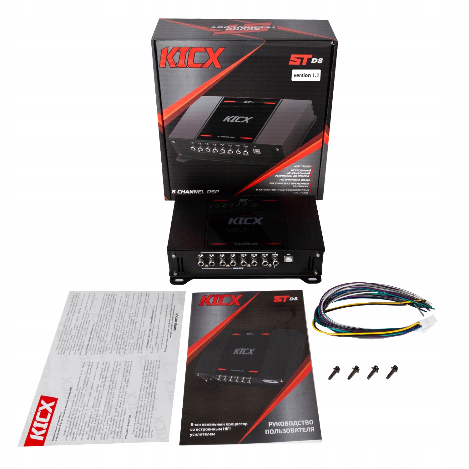 Устройство имеет 8 выходных каналов, встроенный модуль Bluetooth и оптический вход. Он имеет частотную характеристику 20-20000 Гц, соотношение сигнал/шум более 95 дБ и разделение каналов 65 дБ. Разрешение DSP составляет 24 бита, а его мощность — 400 МГц. Устройство поддерживает частоту дискретизации 192 кГц. Усилитель имеет 4 канала класса АВ. Номинальная мощность на 4 Омах составляет 30 Вт на канал, а на 2 Ома — 50 Вт на канал. Он имеет входы RCA (6 каналов) и высокого уровня (4 канала). Устройство оснащено автоматическим включением/выключением через вход высокого уровня.