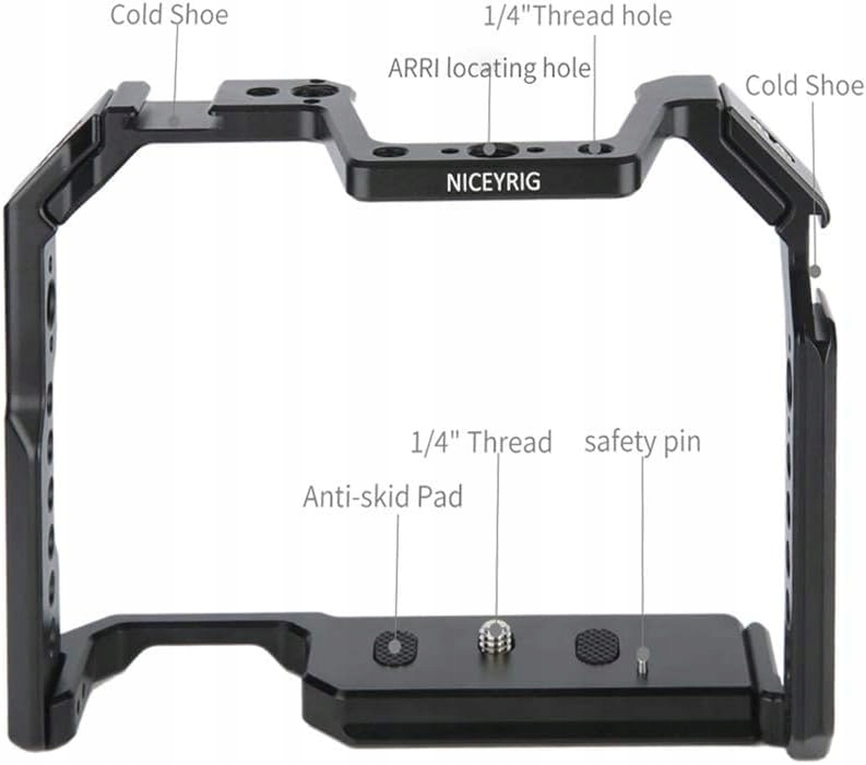 Клетка для камеры NICEYRIG предлагает несколько вариантов крепления со встроенными холодными ножками сверху и слева, что позволяет прикрепить шарнирный кронштейн, крепление электронного видоискателя, микрофон Rode Video, монитор и другие аксессуары. Резьба 1/4"-20 и ARRI 3/8"-16 позволяет прикрепить дополнительные аксессуары.